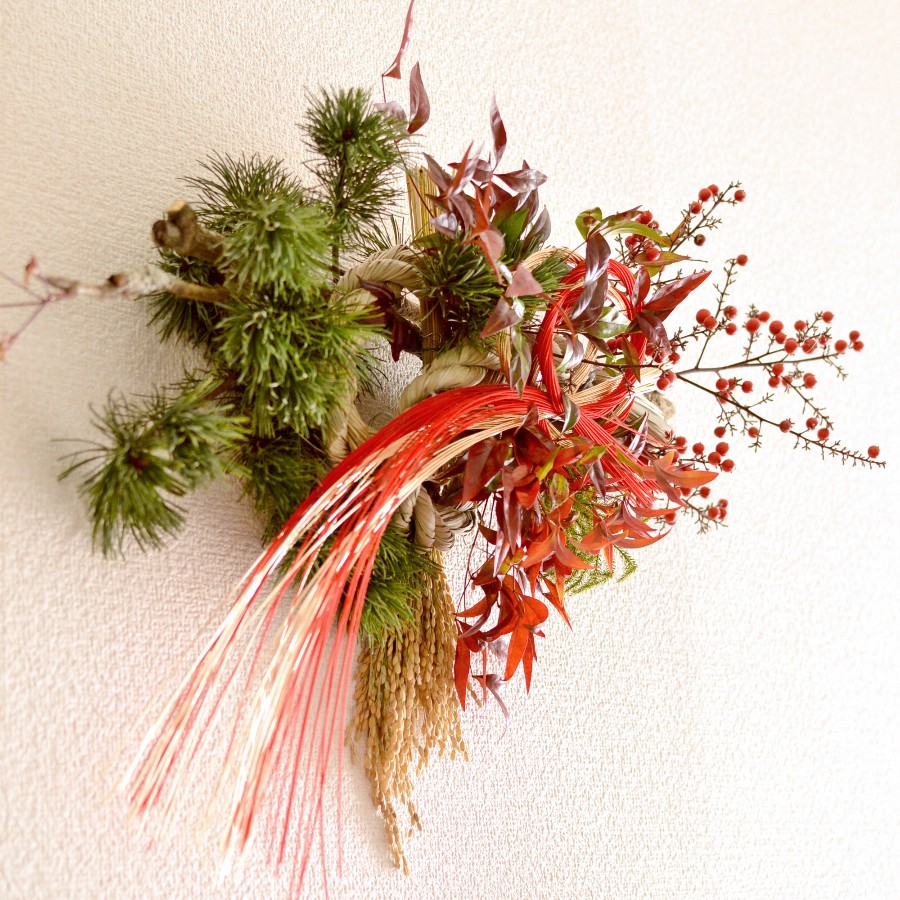 オタフク南天の葉と南天の赤い実・水引の赤が鮮やかできれいなしめ縄飾りです。