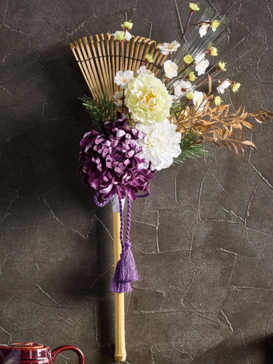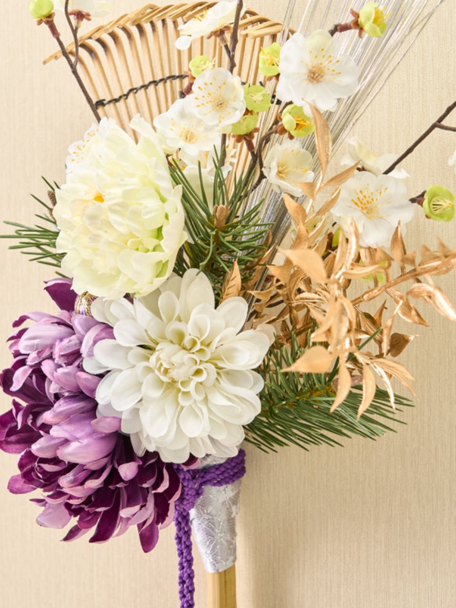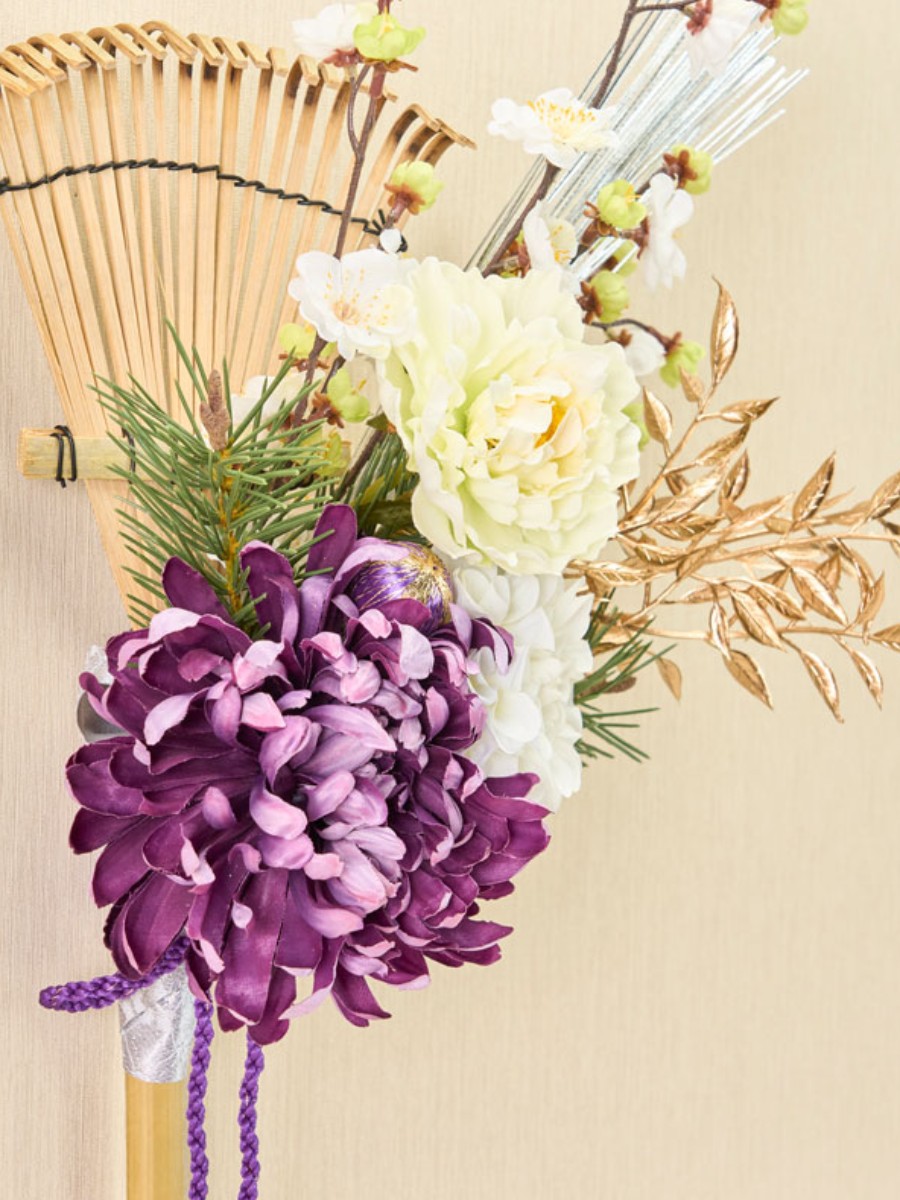 花束のように花材を束ねたあと、熊手にケーブルタイで2か所固定しています。