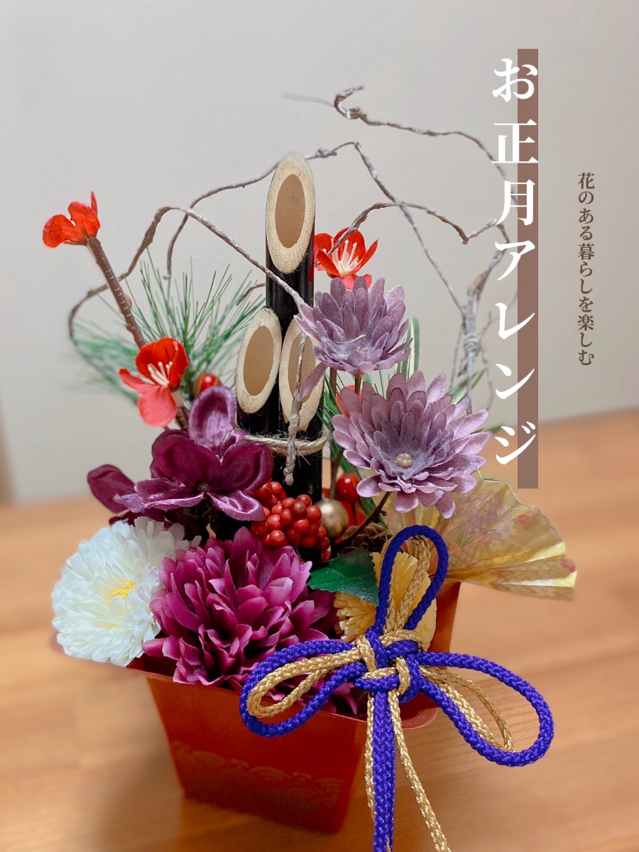 今年度講座の際門松の要望あり、早くも来年用をサンプル作成してみました。今回は器と竹を購入。あとは自宅にあったアーティフィシャルフラワーを使用。市民講座という事もあり花材代に限りがあるため1部百均の花などを使用してます。まだまだ改良の余地あり。洋風タイプも検討してます。