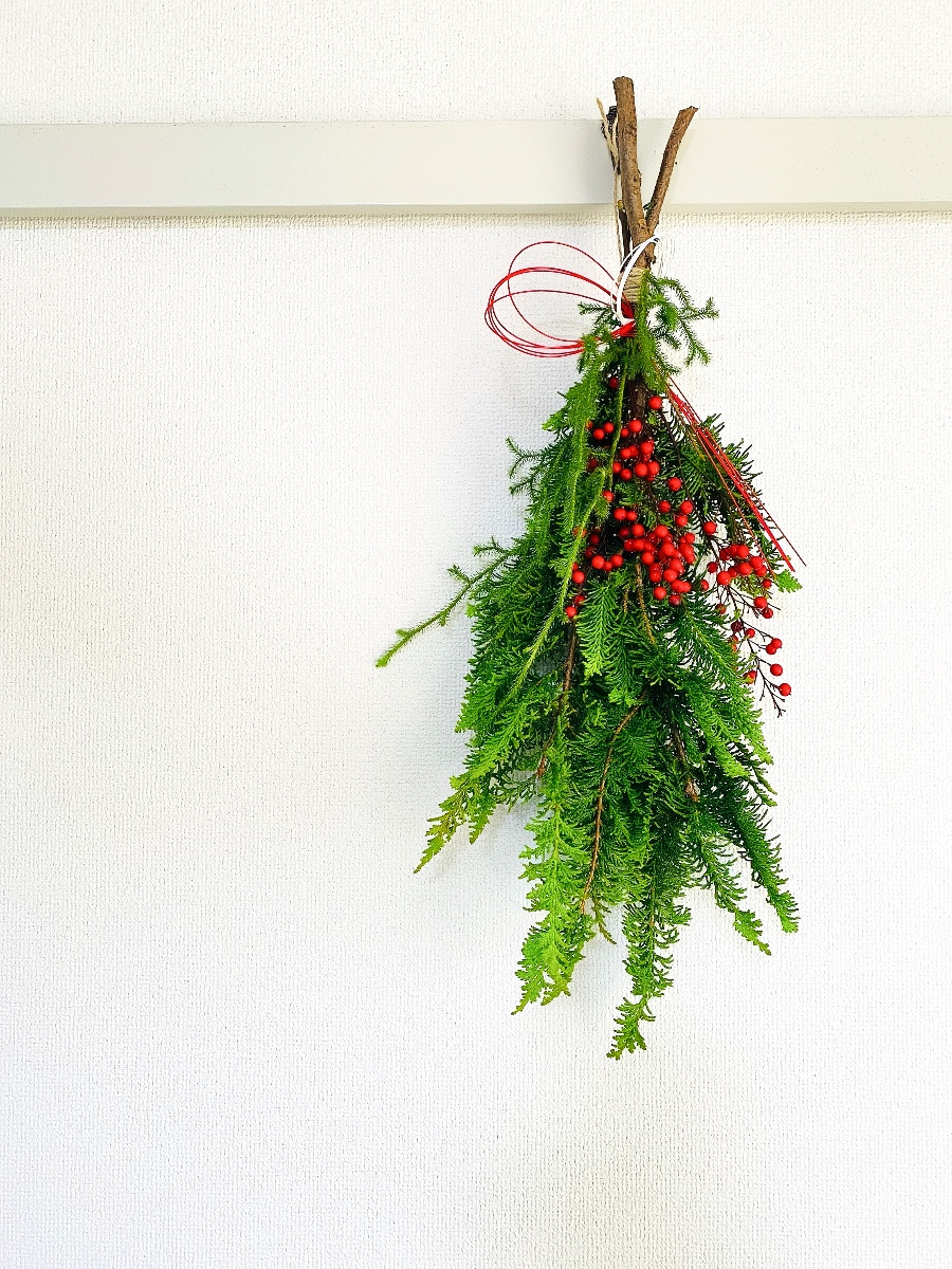 クリスマスレッスンで余ったヒバに、ヒカゲノカズラと南天をシンプルに束ねてお正月らしいスワッグにしました。