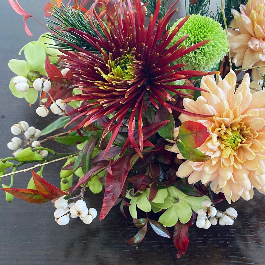 美しいマム(チスパ)は赤茶で花芯がグリーンなので、グリーンのデンファレやマムに赤グリーンのおたふく南天を軽やかに。優しい雰囲気にしたいので、サーモンピンクのマムをあわせてナンキンハゼをチラチラとあしらいました。松は五葉松です。