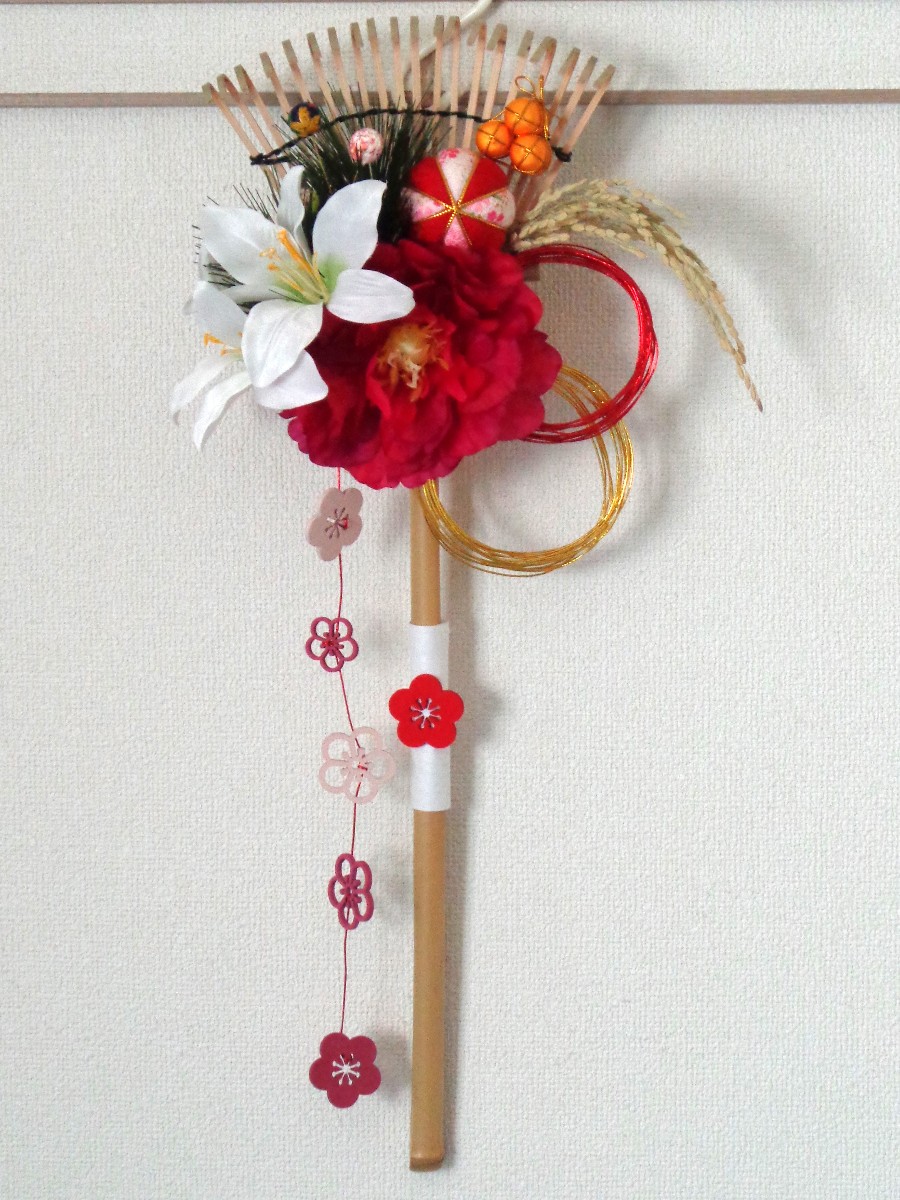 熊手の柄の節の部分が気になったので、和紙を巻き、梅のチップを付けてあります。