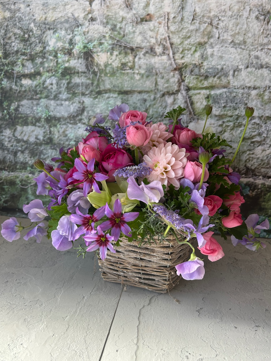 イヴピァッチェ、スイトピー、ローズゼラニウム、ブルーアイス等の香る草花をカゴにたっぷり詰め込みました
