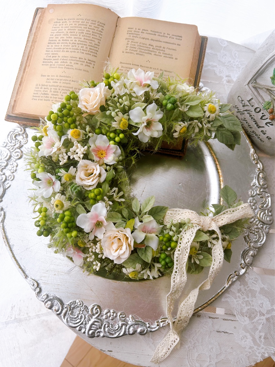 全てアーティフィシャルフラワー(造花)を使い、グリーンとホワイトを基調にした三日月リースを作成しました。シルバーのプレートに乗せて撮影すると、作品が引き立ちます。結構ボリュームがあります。アーティフィシャルフラワーなので、劣化せず長く飾っていただけます。