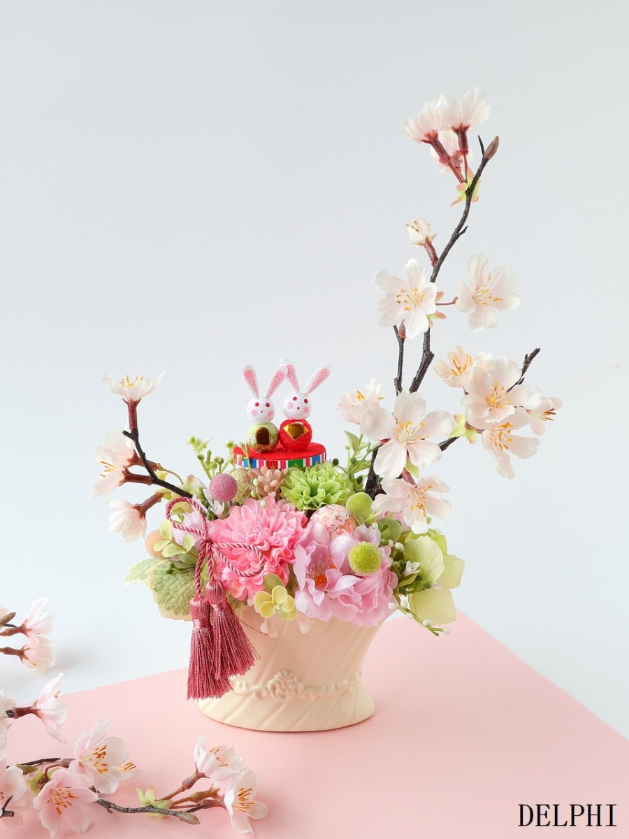 淡雪の桜やマム、紫陽花など優しいパステルカラーでまとめています。