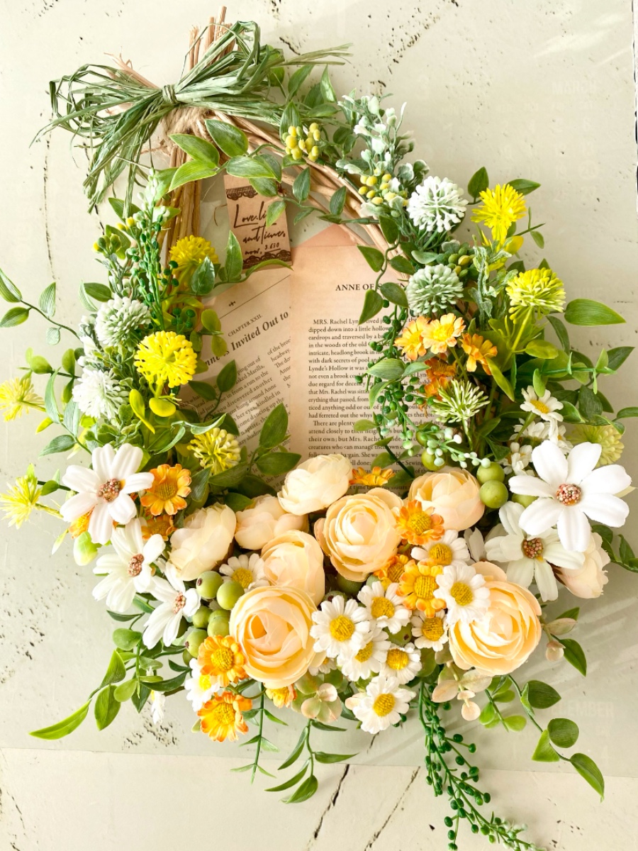 イエローベースの優しい淡色小花がグリーンに映えるナチュラルリースに仕上がりました♡