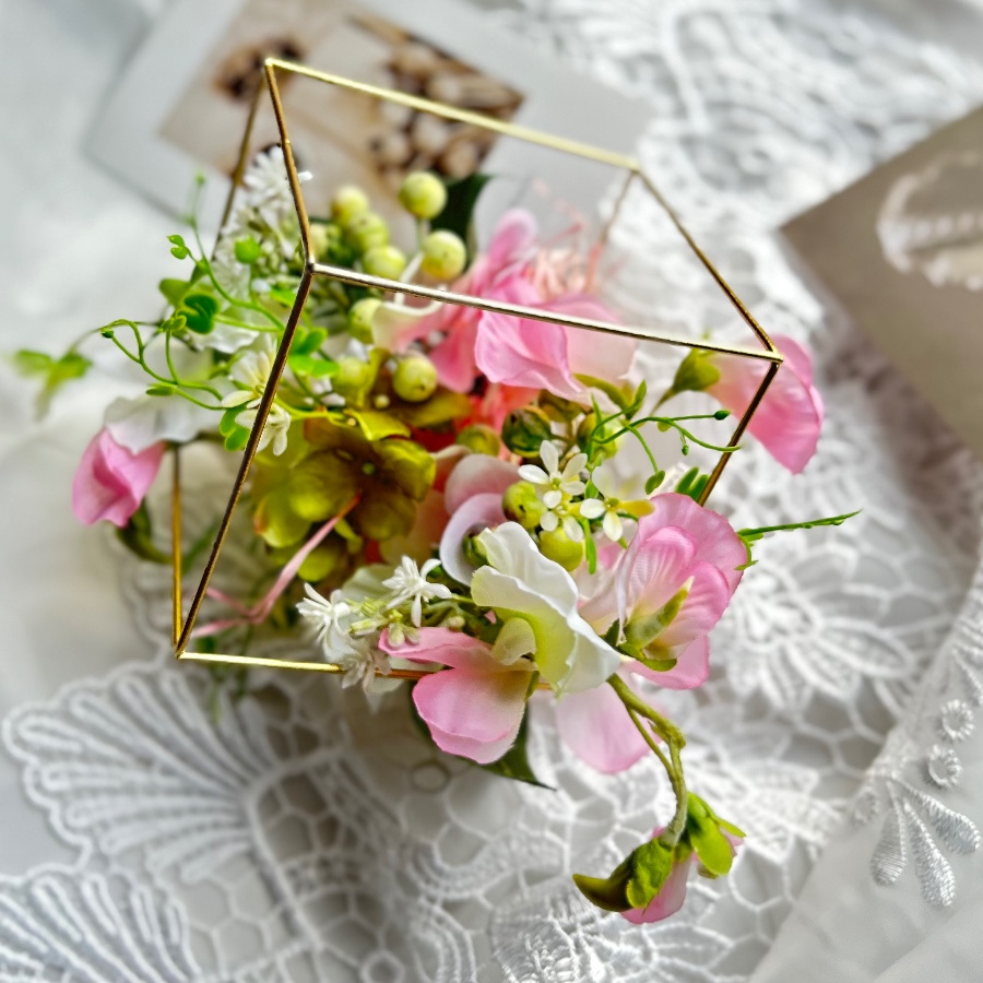 ワイヤーキューブの三角形の部分を底にブーケを固定しました。フローラルフォームを使わないことでお花がふんわりと綺麗に見えます。
