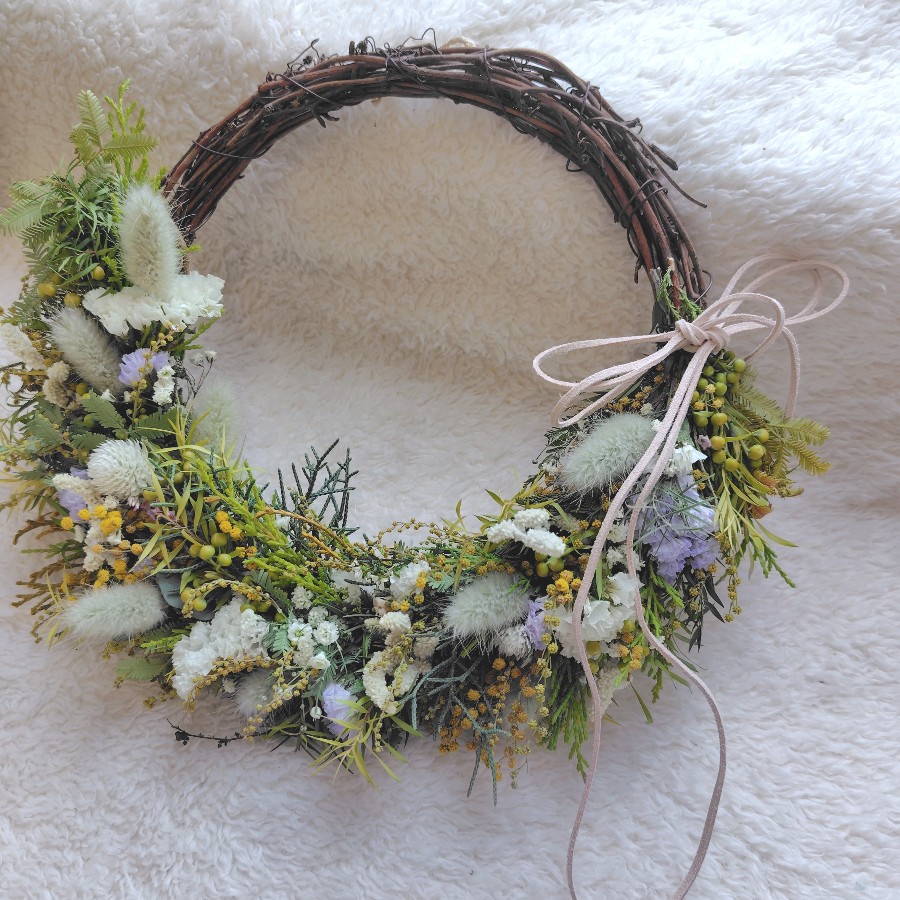蕾のミモザや咲き始めのミモザと小さな花々、たくさんの種類のグリーンを使って作ったリースです。