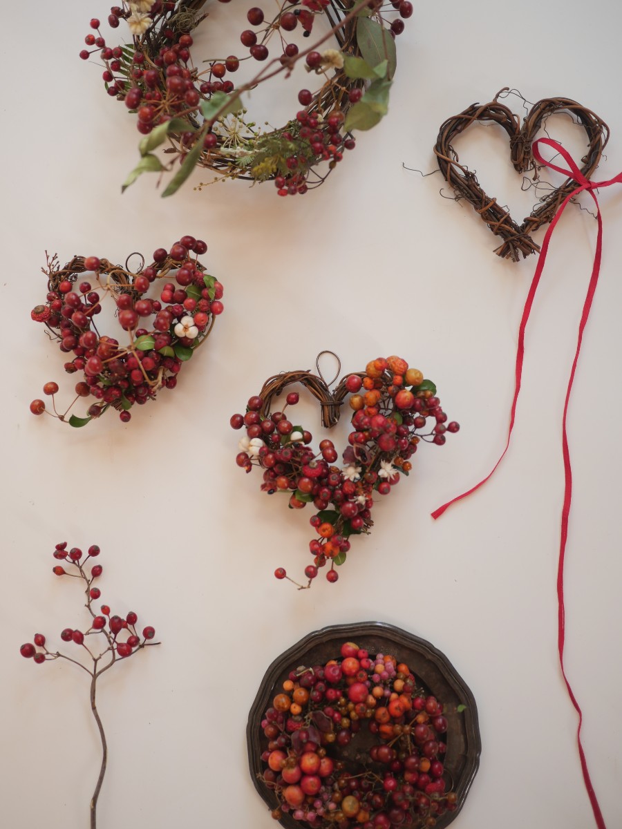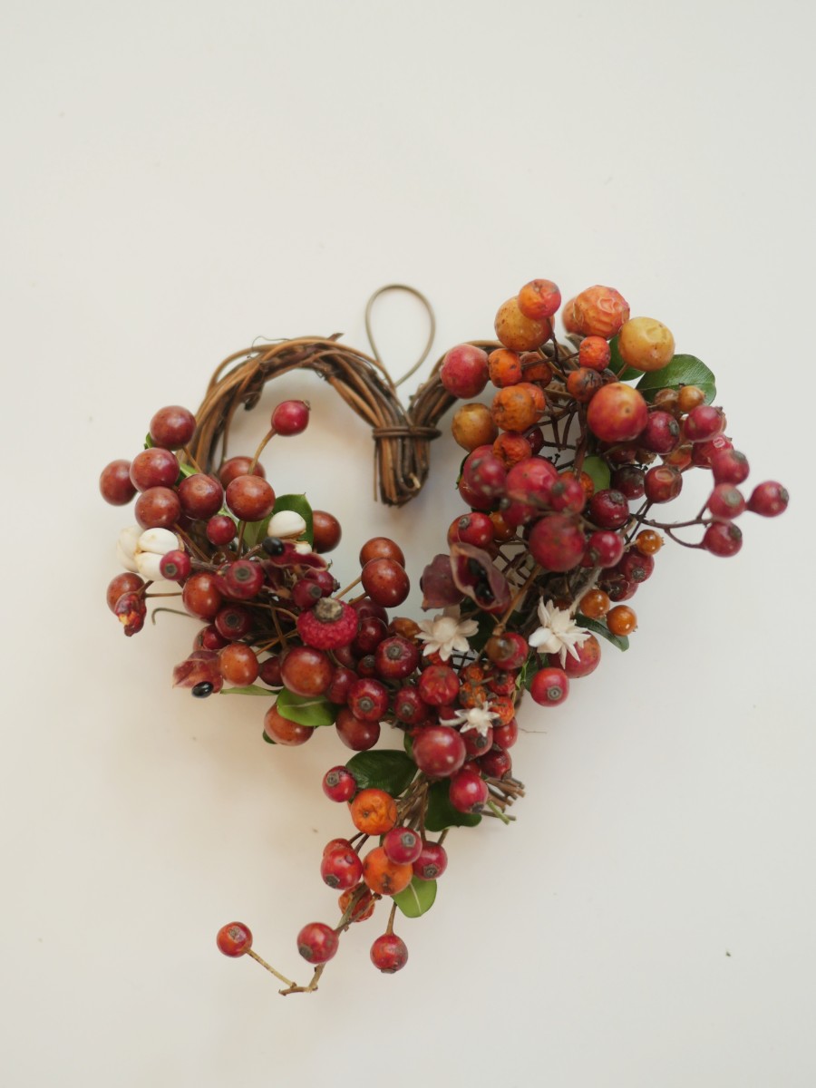 赤やピンクの実を詰め込んだハートのリース