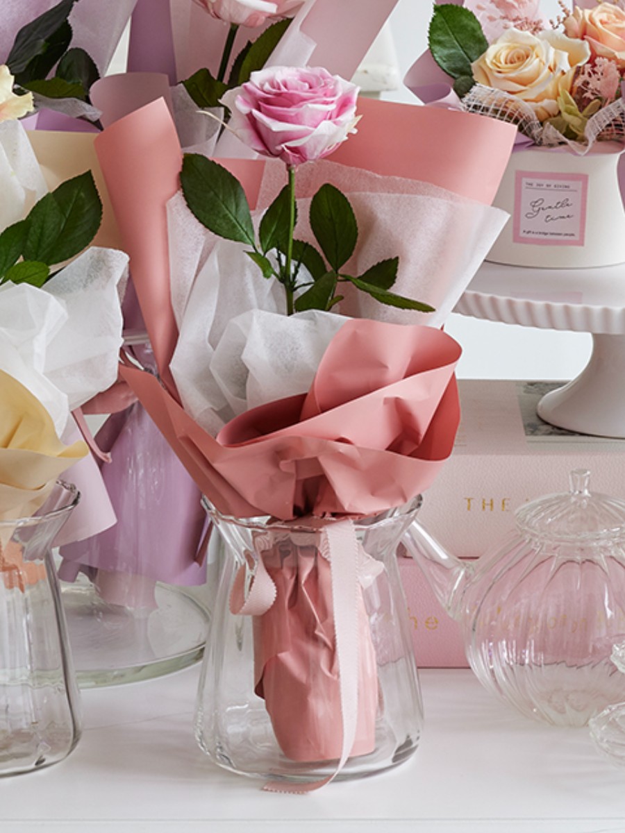 1輪のプリザーブドのバラにステムを付けて長さを出し、1本で想い伝えるギフトに♪