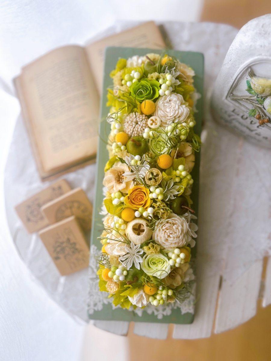 ダスティグリーンに塗ったボードに、爽やかな色合いの花材をふんだんにあしらいました。劣化しにくい花材を使用しましたので、長く飾っていただけます。プレゼントにも最適です。