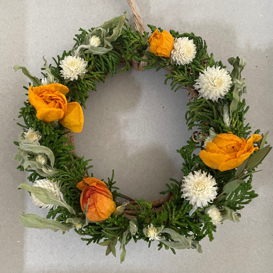 ヒバ、ユーカリなどのグリーンに、ラナンキュラス、千日紅のドライフラワーをあしらいました。