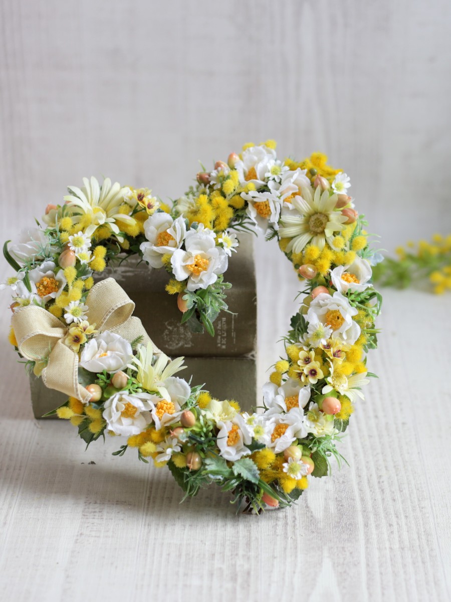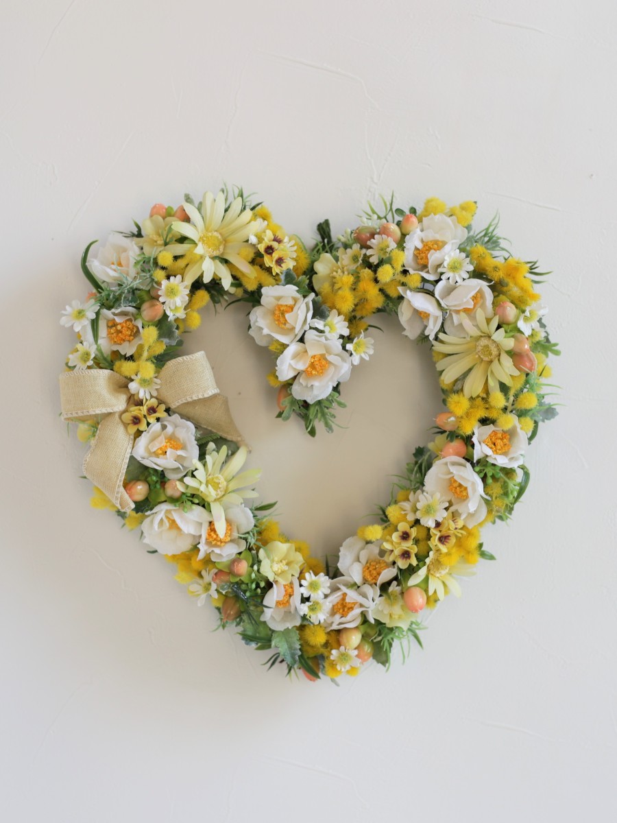 ホワイト~クリーム~イエローのグラデーションが春の明るい日差しを思わせるリースです。