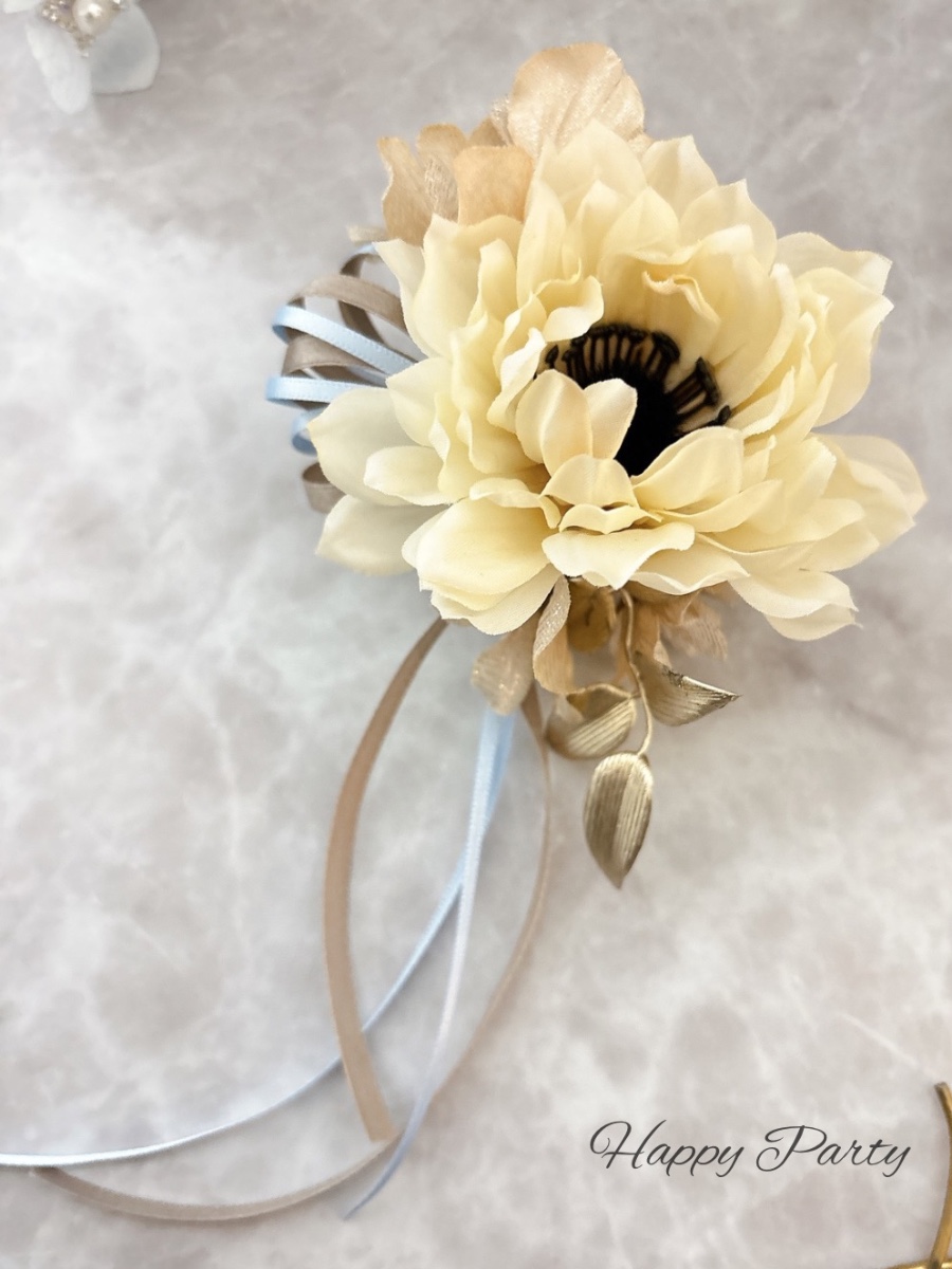 上品なオフホワイトのアネモネ、紫陽花、ゴールドリーフ