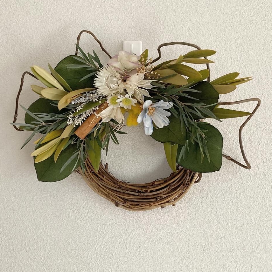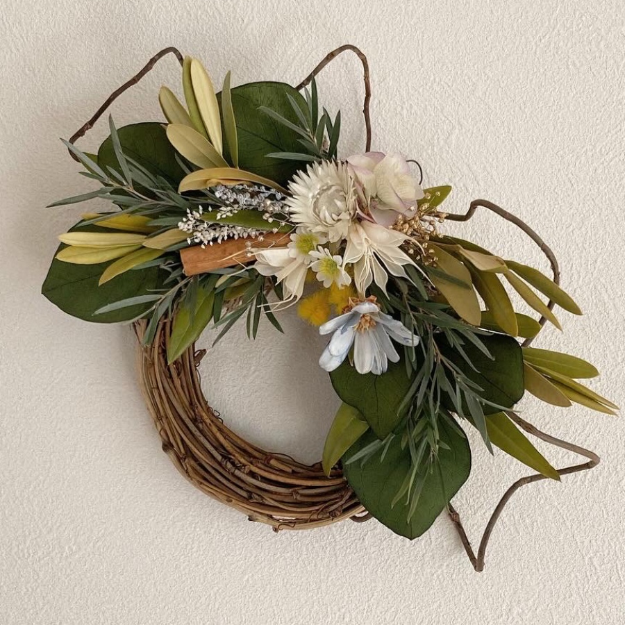 ドライのオリーブにプリザのユーカリ、ティーツリーをベースにリースのツルをほどいてデコレーションしました!斜めにかけても動きがありオシャレです♪