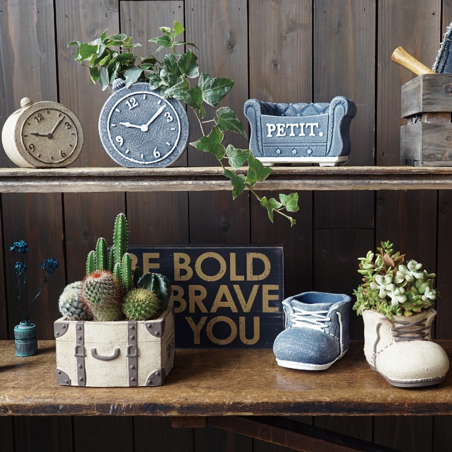 ソファーや時計などをモチーフにしたおしゃれなセメント製の鉢。