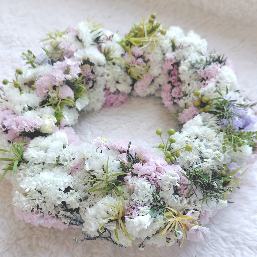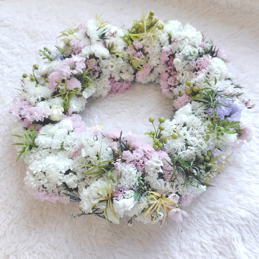 純白のスターチスと桜色のスターチス、春の息吹を感じさせるライムグリーンの植物を合わせたシンプルなリースです。