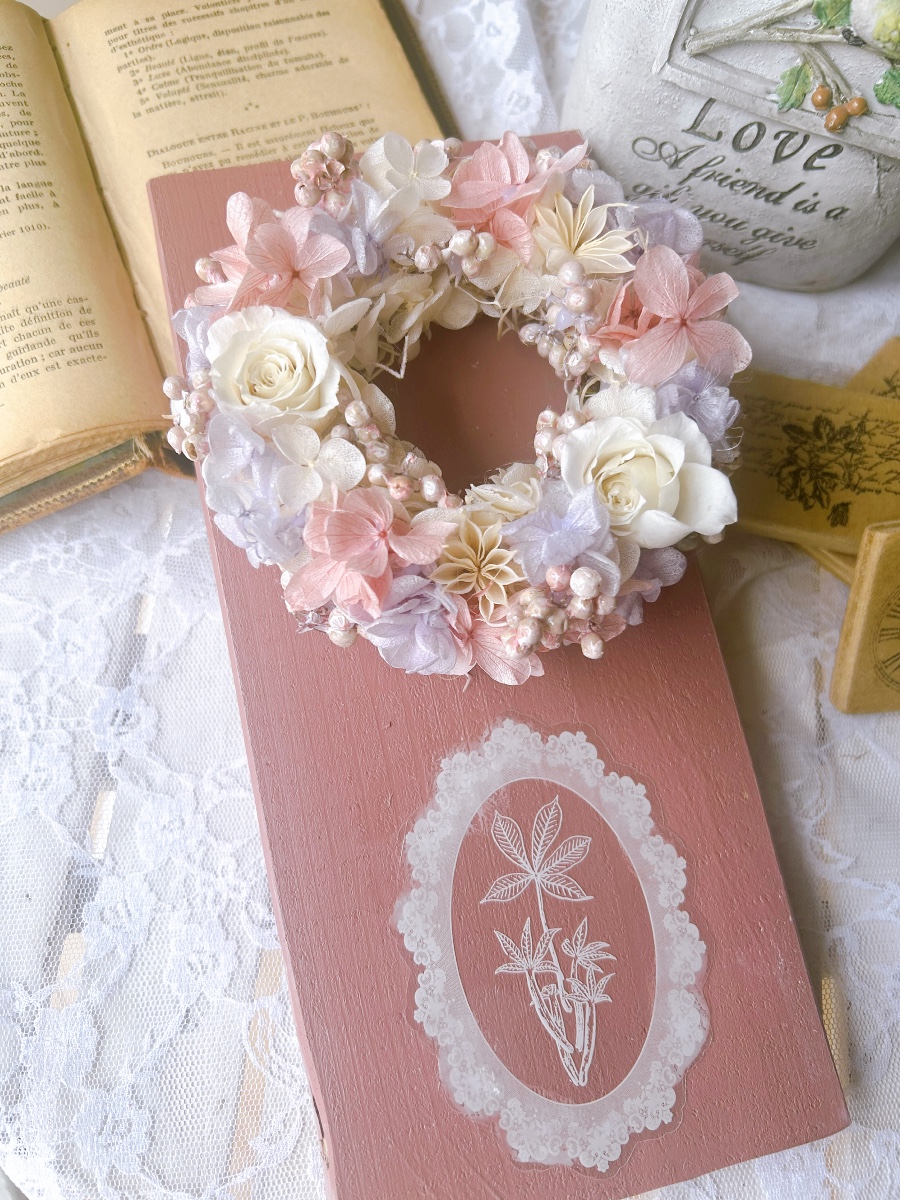オールドピンク色のペンキでボードを塗り、春らしい配色のリースを飾りました。ミニリースは取り外し可能です。可愛らしい仕上がりで、プレゼントに最適です。