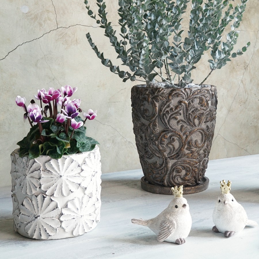 可愛い動物のオブジェをはじめ、アフリカンやエスニック系のかっこいい系、アラベスク柄やダマスク柄といったエレガント系のものまで、どなたでもお取り扱いいただけるように幅広いジャンルのデザインの鉢を数多く企画開発しております。