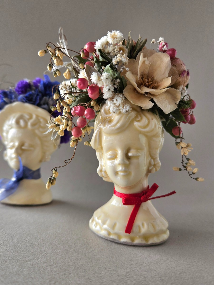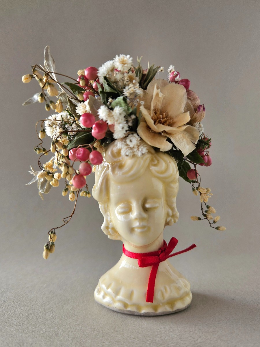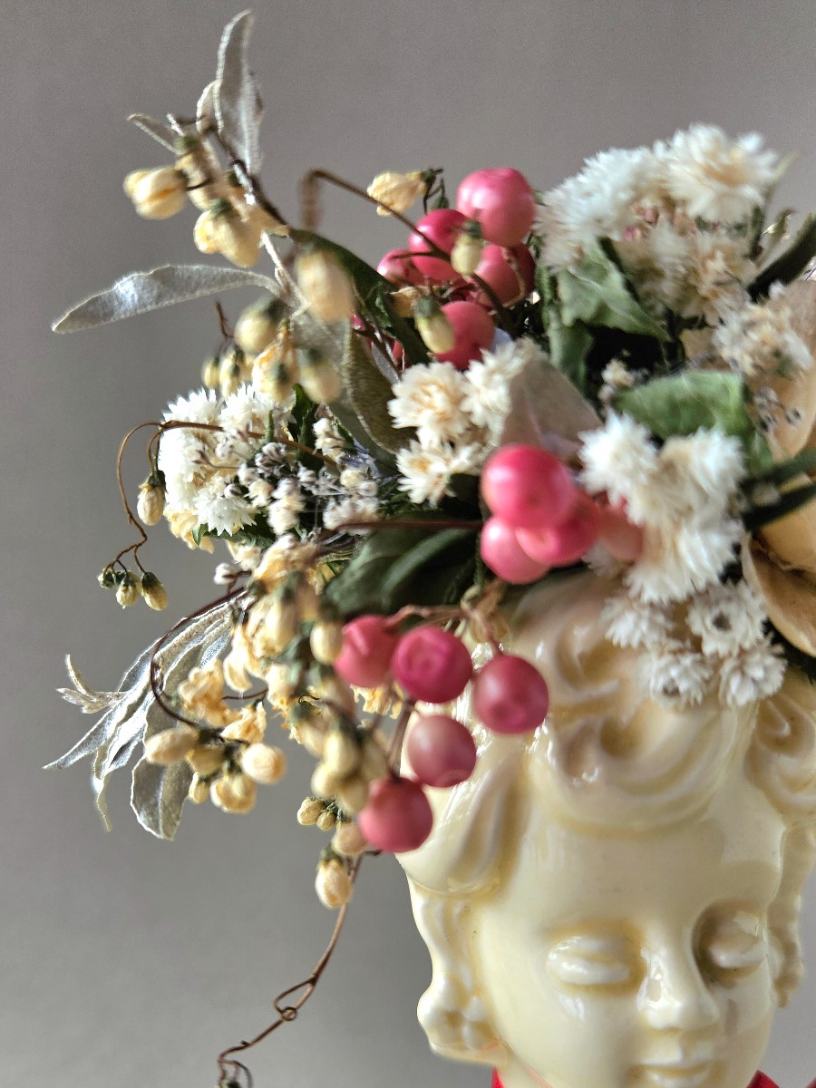 少女をモチーフとしたアンティークポットにドライフラワーをたっぷりあしらいました。
