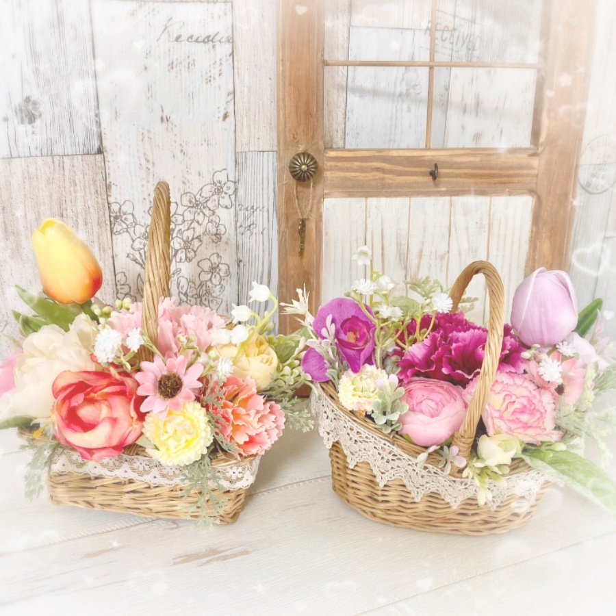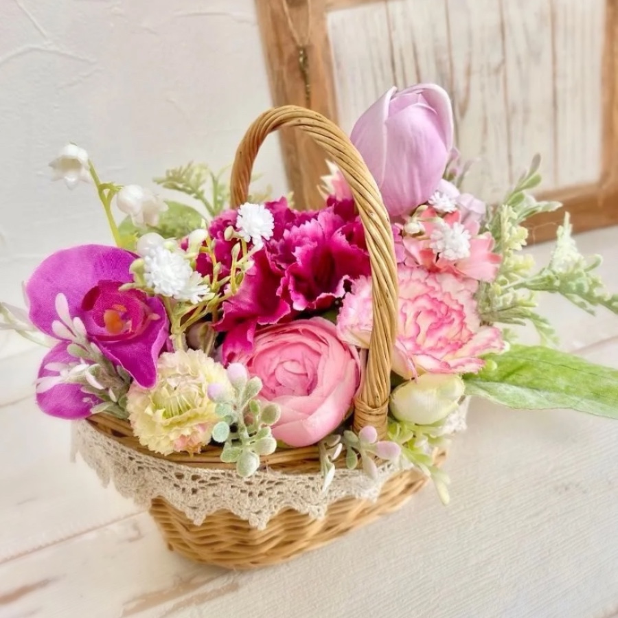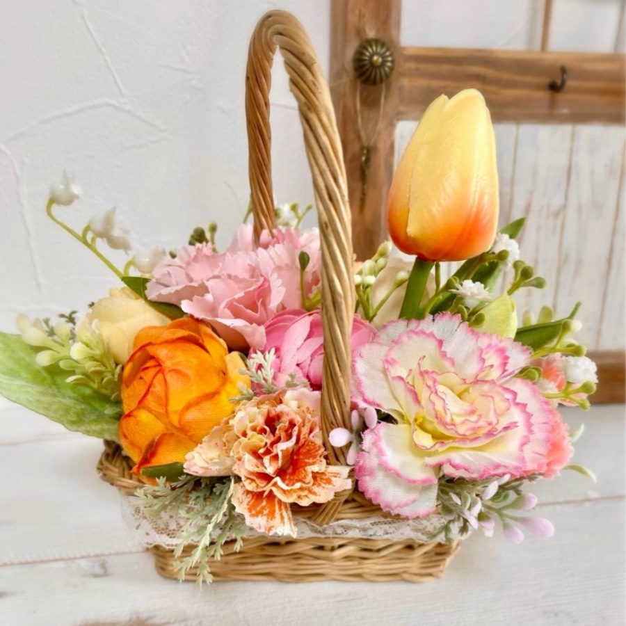 チューリップや数種のカーネーション、ラナンキュラスなどパッと華やかで可愛らしく仕上げた母の日に向けて制作したバスケットアレンジです。