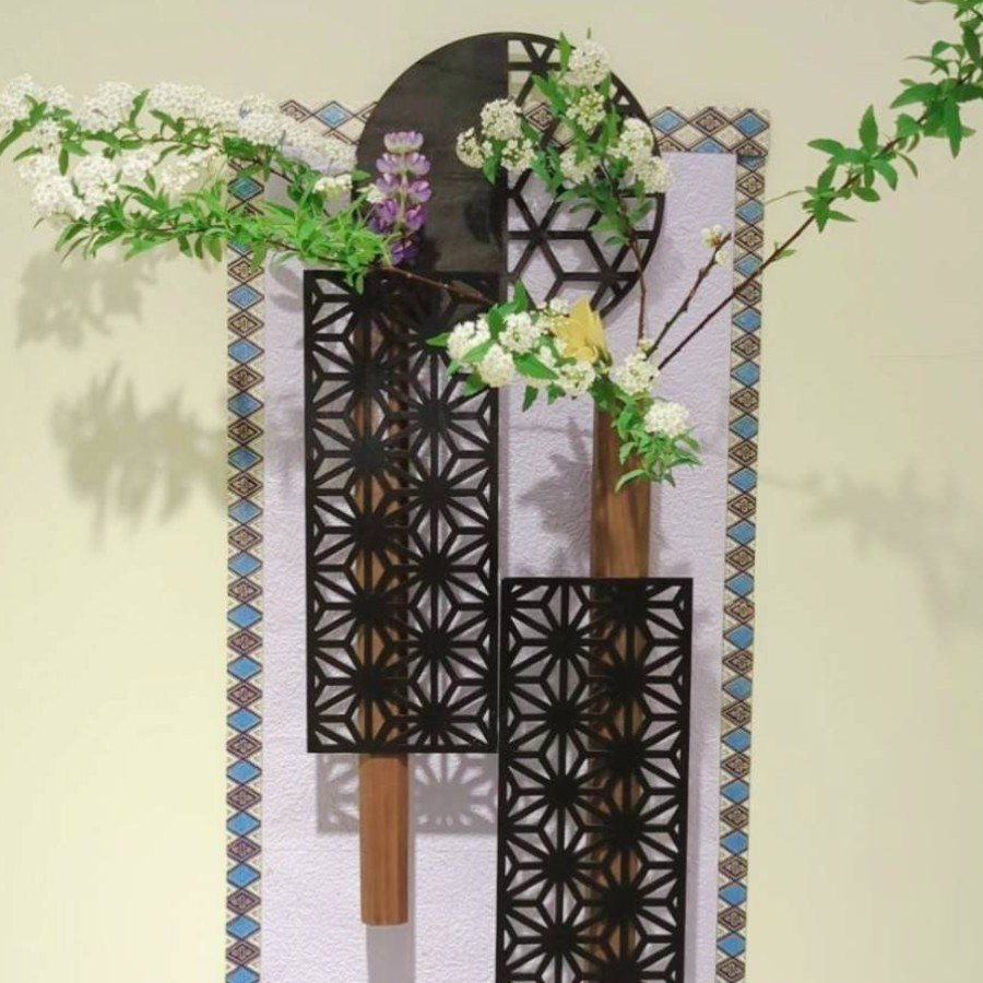 今回の花展で初めて掛けの自由花を出展、伸びやかな生徒の作品と共に、多くの方にご覧いただきました。。