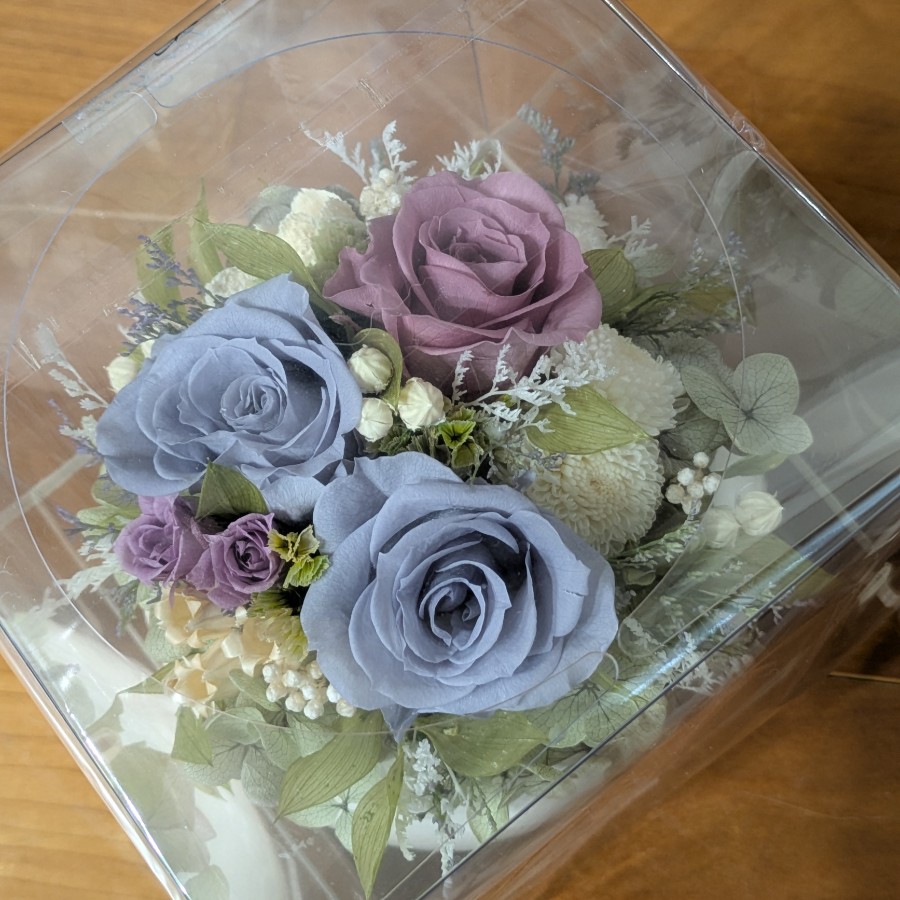 気持ちが和むような色合いのダスティーブルーとグレイッシュパープルのバラを使い、柔らかな雰囲気に仕上げました。