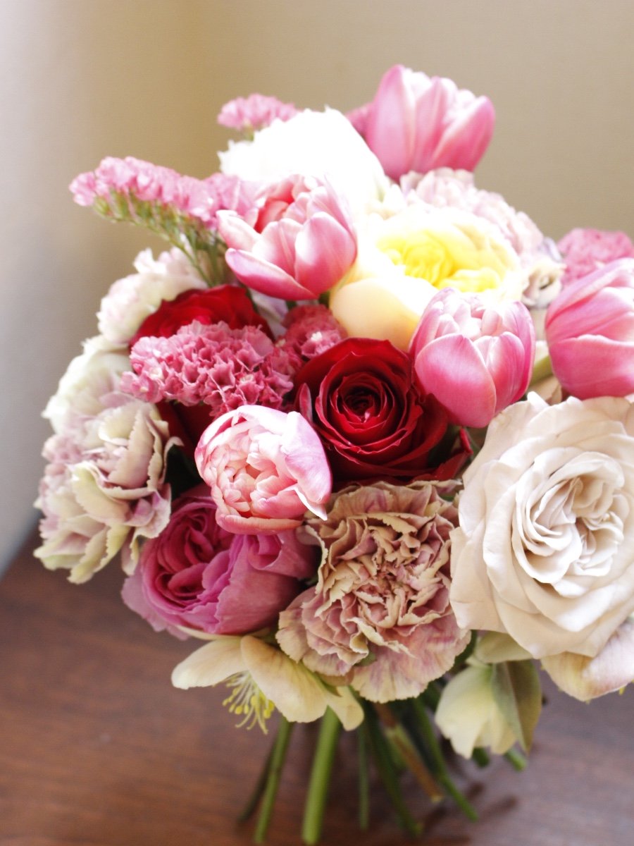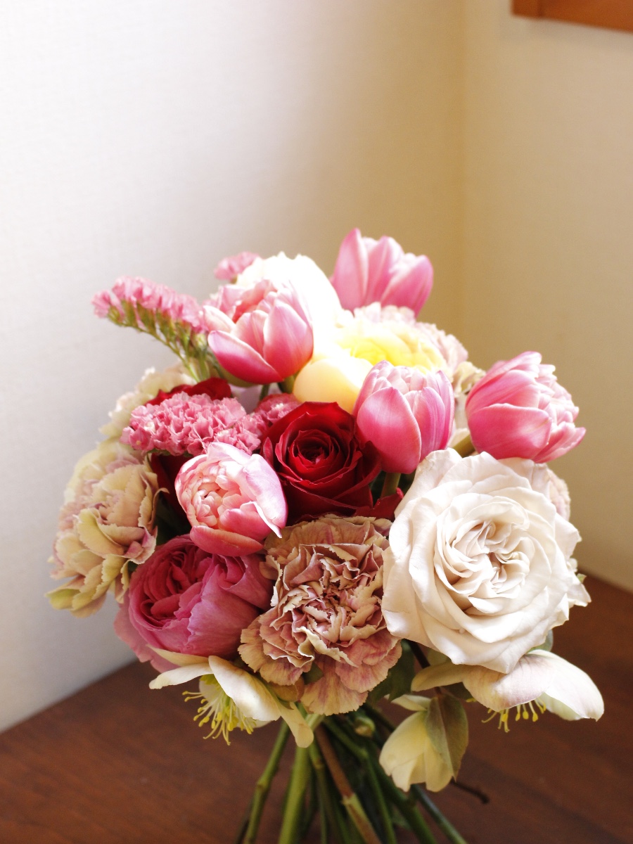八重のチューリップやMIXバラ、ニュアンスカラーのカーネーションに、庭に咲いたクリスマスローズを添えてラウンドブーケにしました。