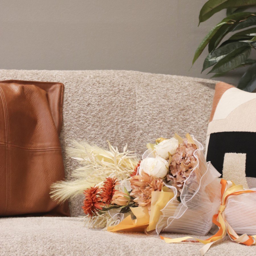 リビングやベッドサイドにそっと置くだけで、空間がやさしい秋色に染まるナチュラルブーケです。