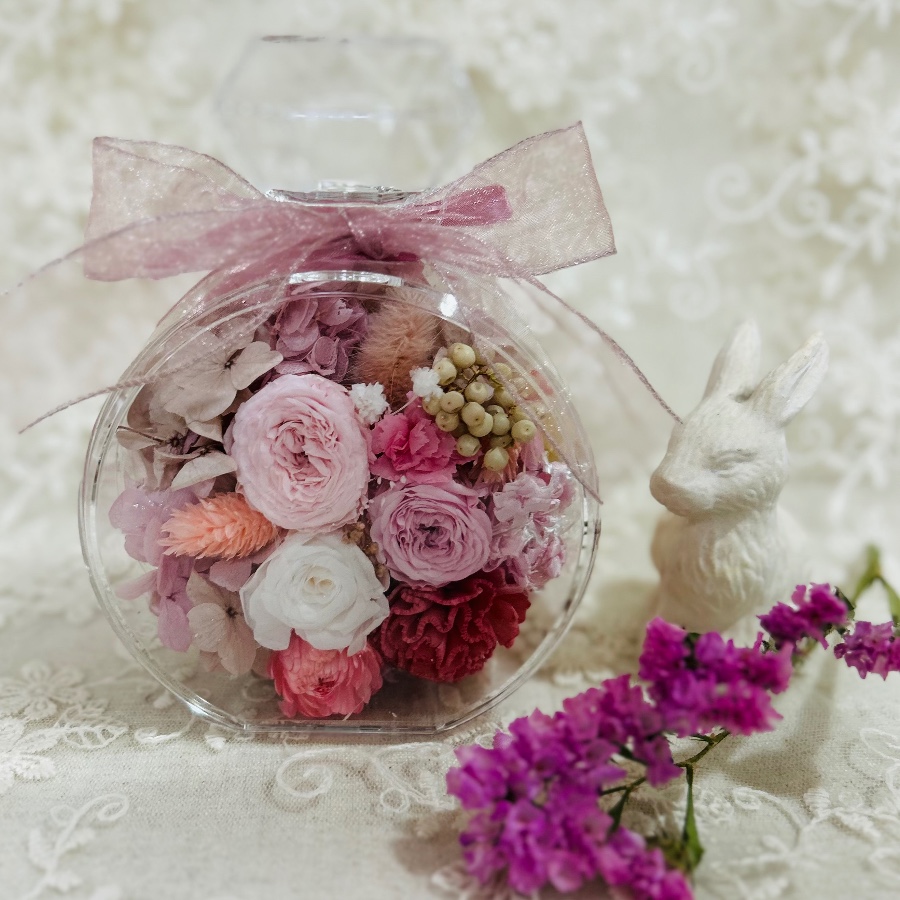 ロマンチックな香水瓶型のクリアボトルのアレンジメント。間にシートを挟んで、表面と裏面で違うデザインを楽しめます。