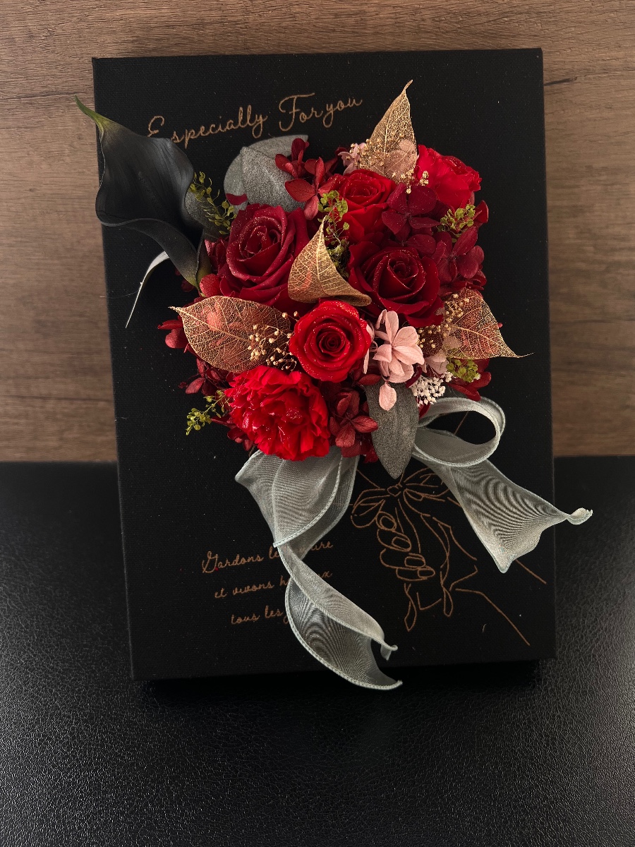 ブーケの部分に好きなお花(プリザーブドフラワー、アーティフィシャルフラワー)をアレンジしました。