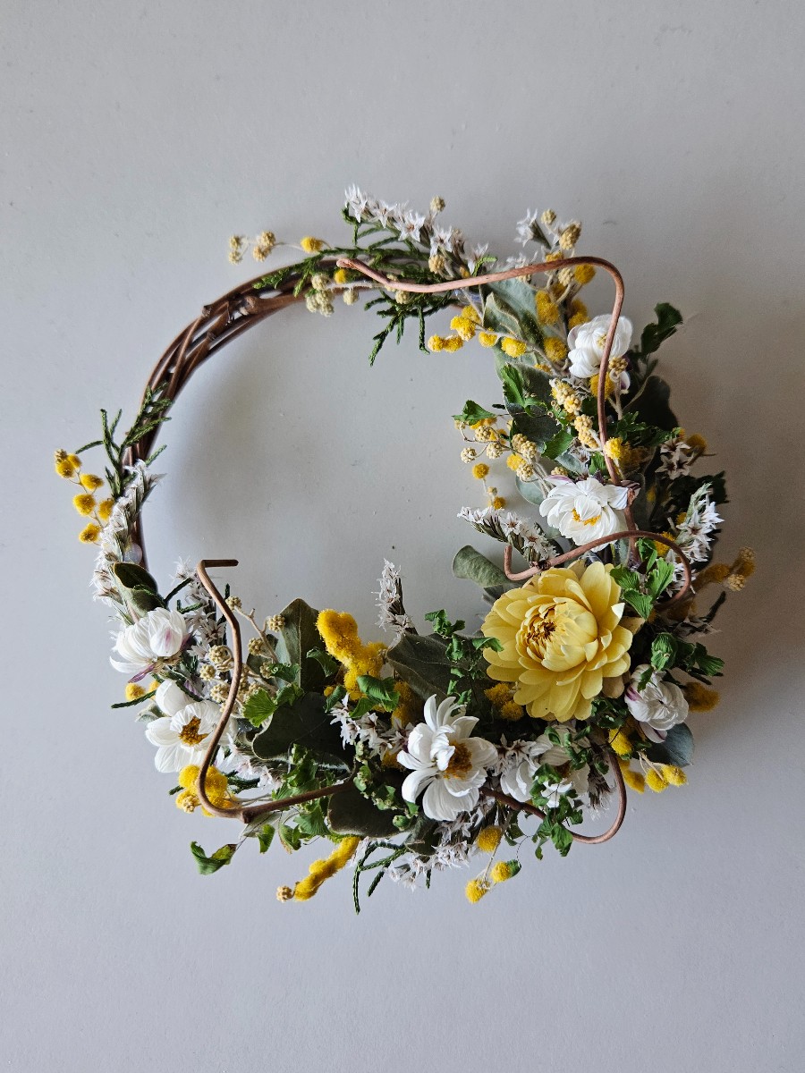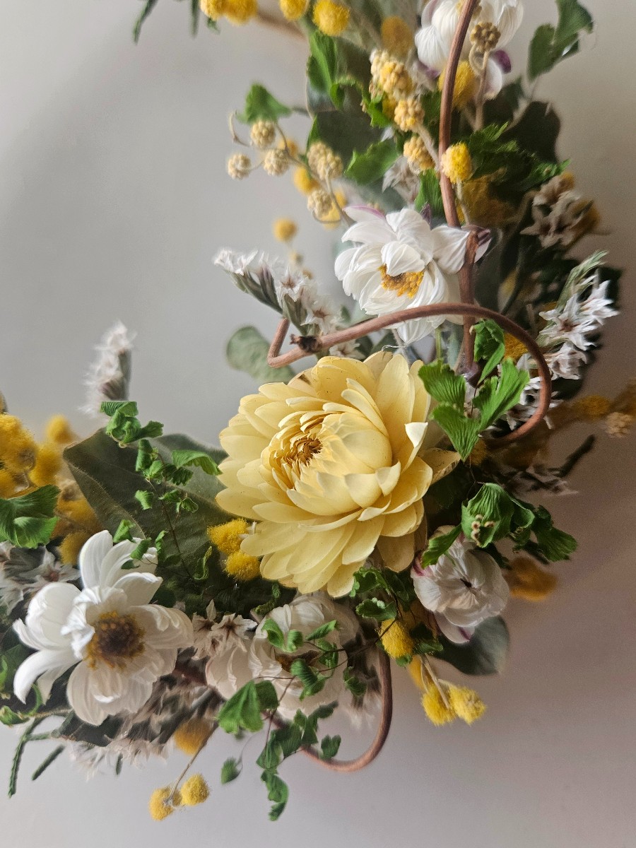 ミモザとハナカンザシ、フレッシュなグリーンをあしらった春らしい色合いのミニリース。