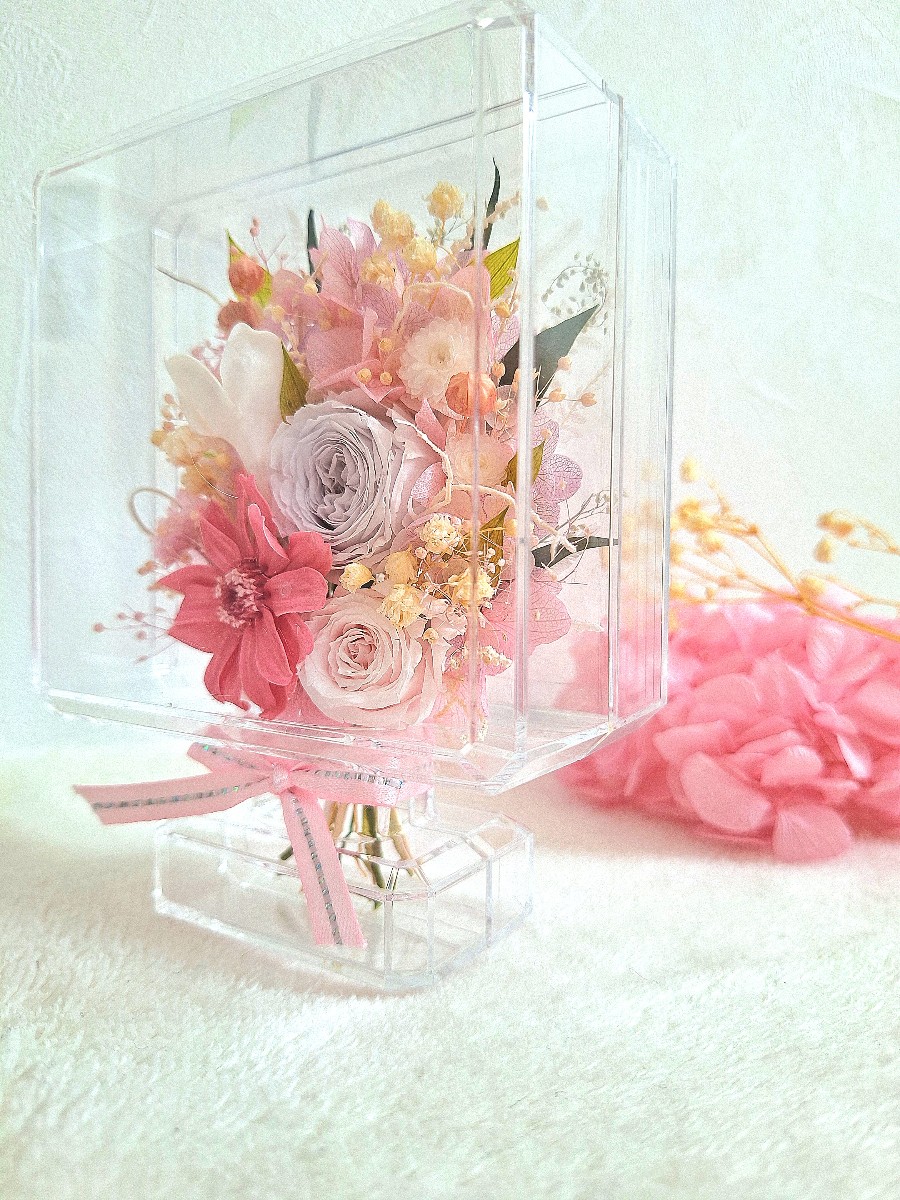 逆さまにして、間にアクリル板を入れて春色ブーケを閉じ込めました。