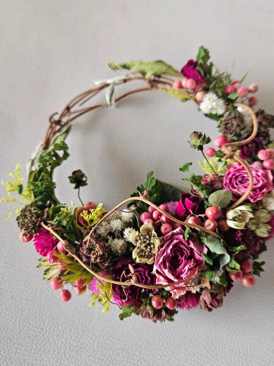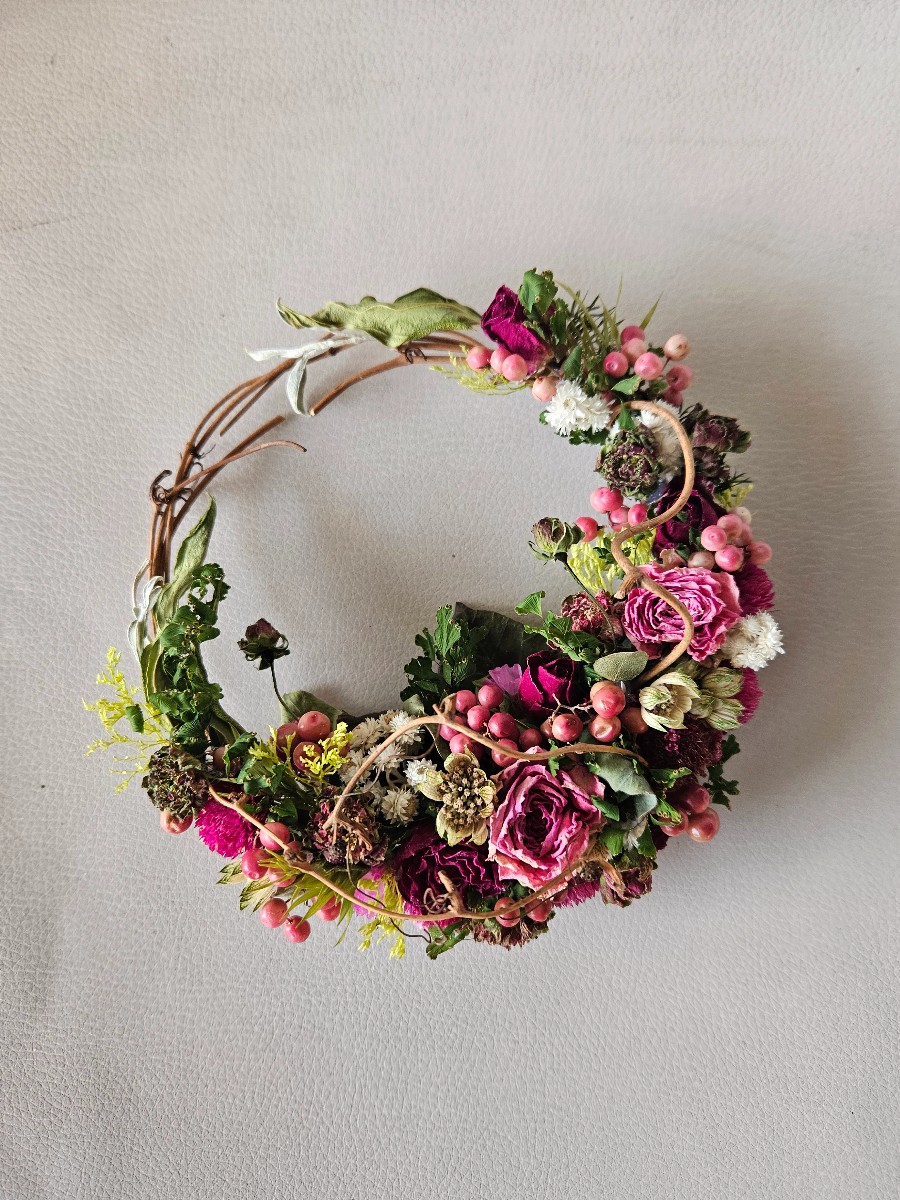 自家製ドライのスプレーバラ2種を使用した、ナチュラルな雰囲気のミニリースです。