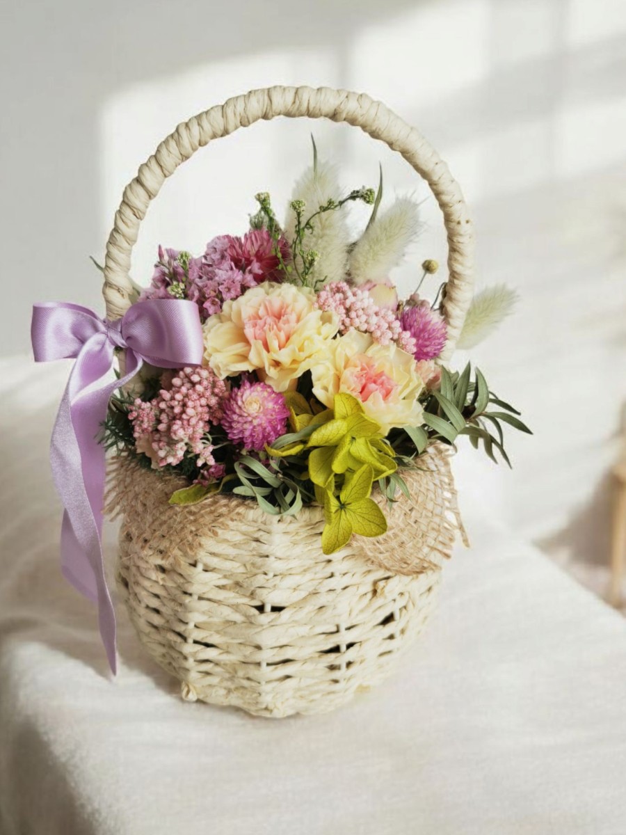 コロンとかわいいフォルムのバスケットに、プリザーブドフラワーのカーネーションやあじさい、色もちの良いドライフラワーをあしらった優しい雰囲気のアレンジメントです。