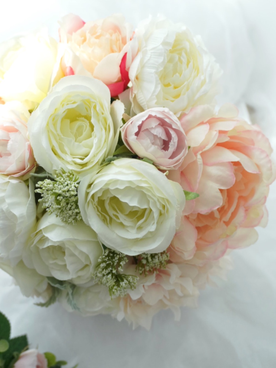 ホワイトバラやラナンキュラス、芍薬をふんだんにお入れしたボリューム満点のブーケです。