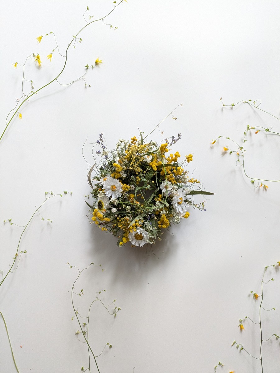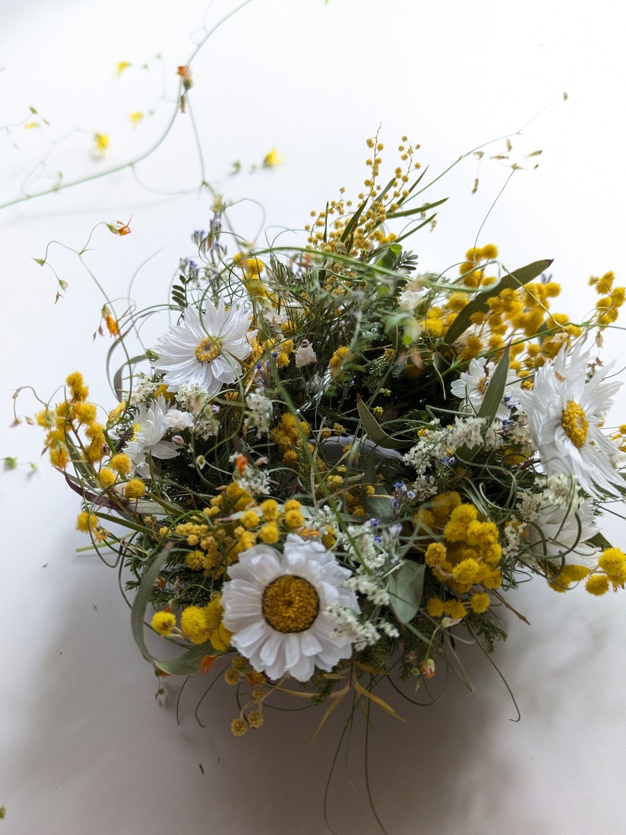リースやブーケの中にストーリー性があり、草花が風にゆれる自然の景色をそのまま切り取ったかのような作品づくりをしています。