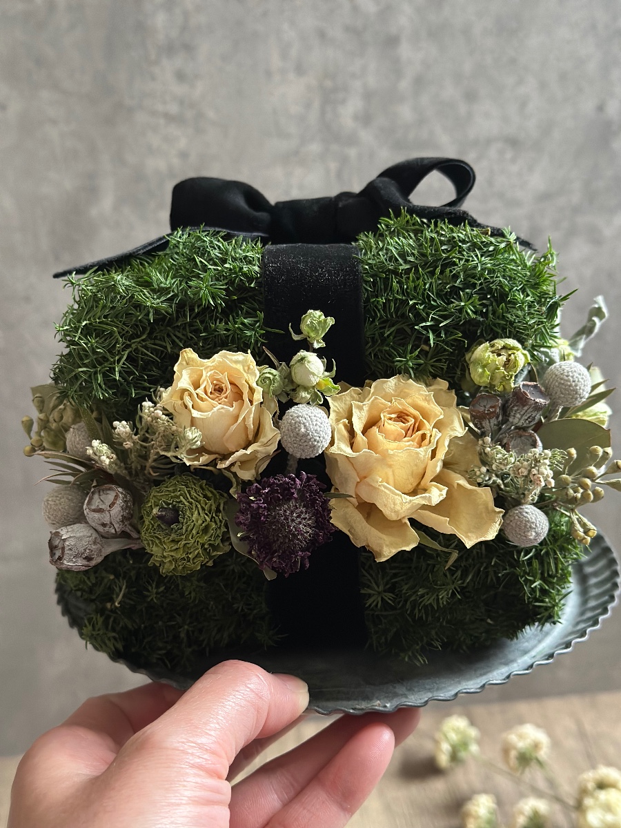 プリザーブド加工のヒムロスギで土台を作り、ドライフラワーをあしらってギフトボックスを制作しました。