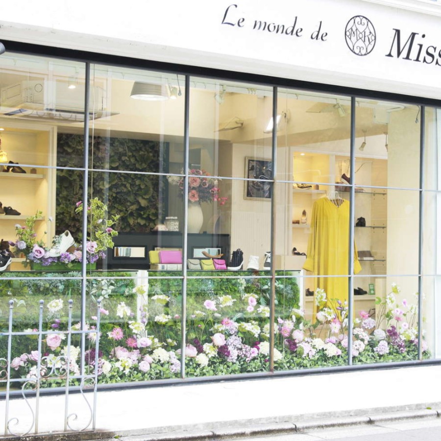 ナチュラルなグリーンと華やかな花々が、上質なショッピング空間を彩っています。