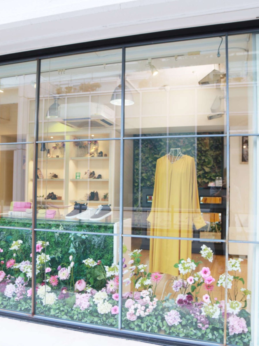 洗練されたガラス張りのファサードに、美しいフラワーアレンジメントが映える店舗ディスプレイ。