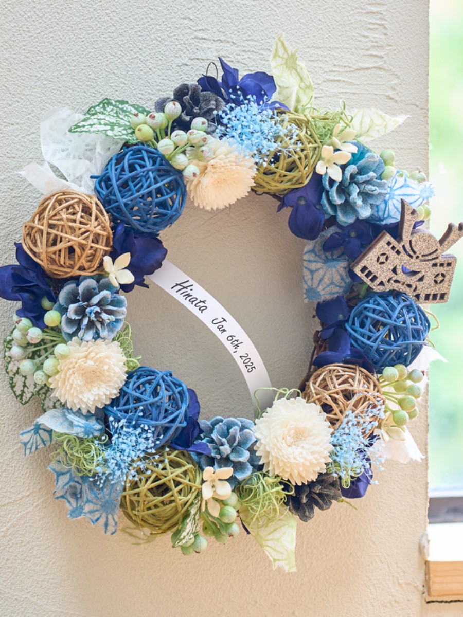 丸っこいブルー系の花や実物と小物を合わせて、爽やかに仕上げました。