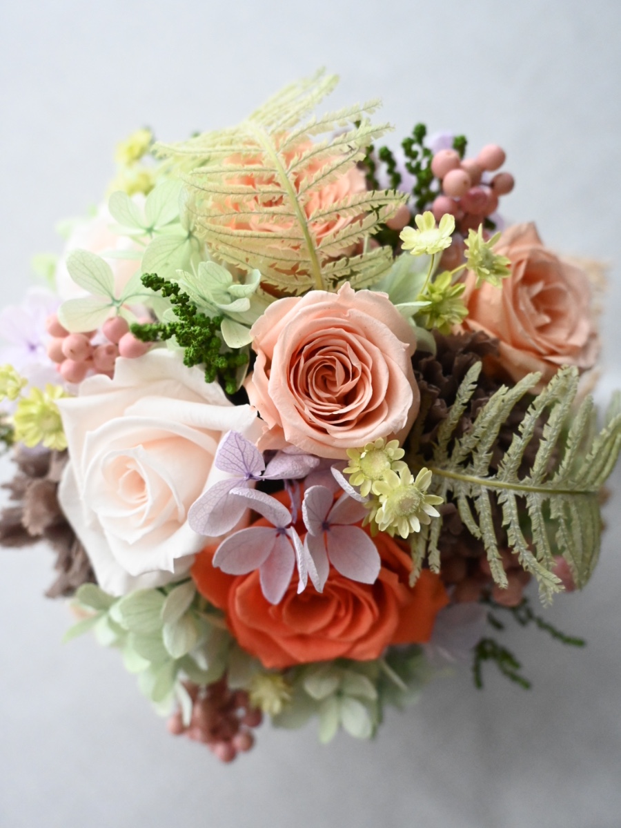 白いバスケットにコロンと丸くアレンジしました。山シダをアーチに見立てて、バスケットの中の小さなバラ園というイメージで作っております。ふわっと優しく可愛らしいアレンジです。