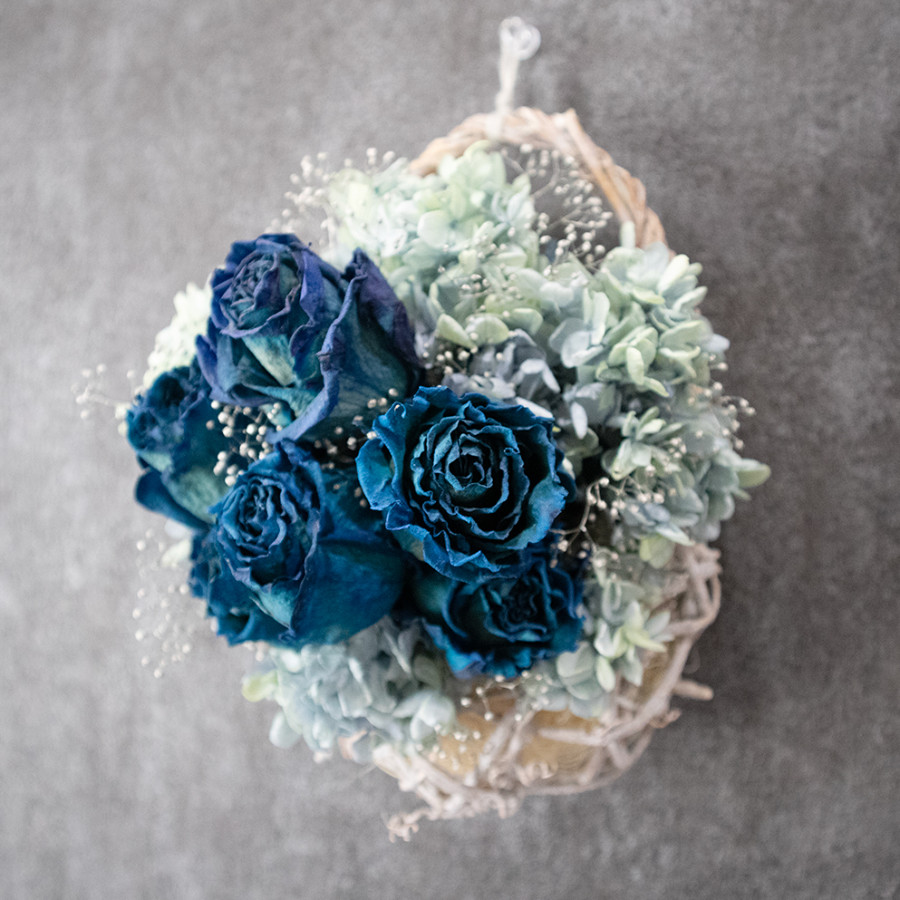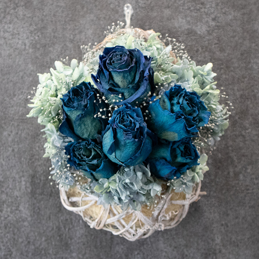 薔薇・モンディアルブルーを6本使った小さな花籠です。