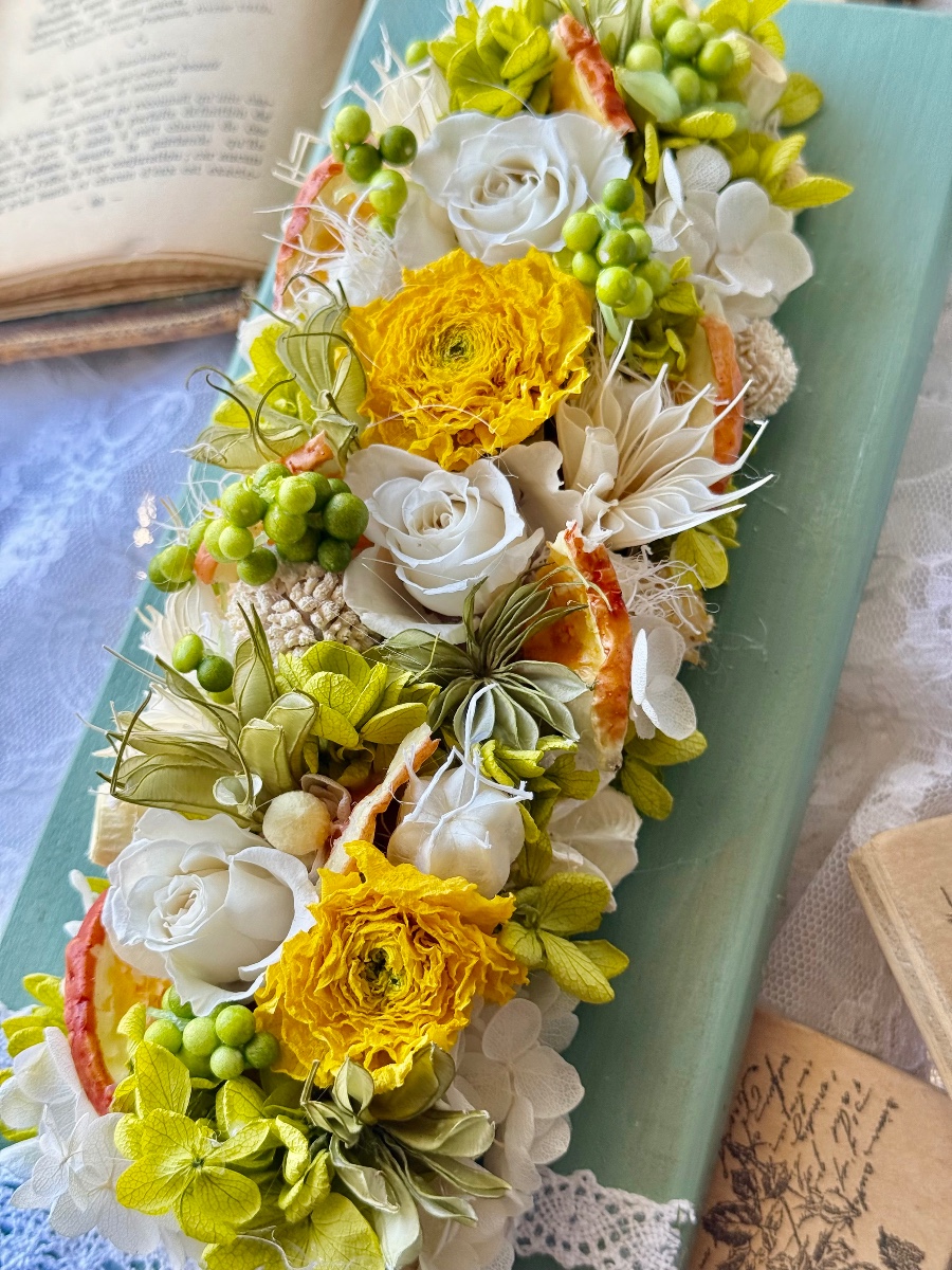 ダスティグリーンに塗ったボードに、黄色の芍薬のドライフラワーを中心に、白色バラのプリザーブド、緑や白のニゲラ。フェイクのオレンジをアレンジしました。