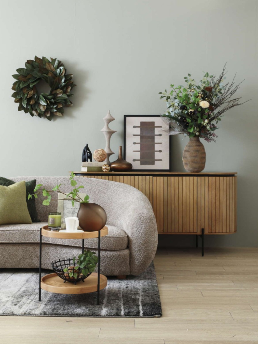 ベースに使用されたざらりとした質感の陶器製の花器は、アースカラーでありながらモダンさも感じさせ、木製のキャビネットとの相性も抜群です。ソファのクッション、壁のリースやアートピース、コーヒーテーブルの雑貨に至るまで、すべてが自然体で調和し、温もりのある北欧インテリアを実現しています。