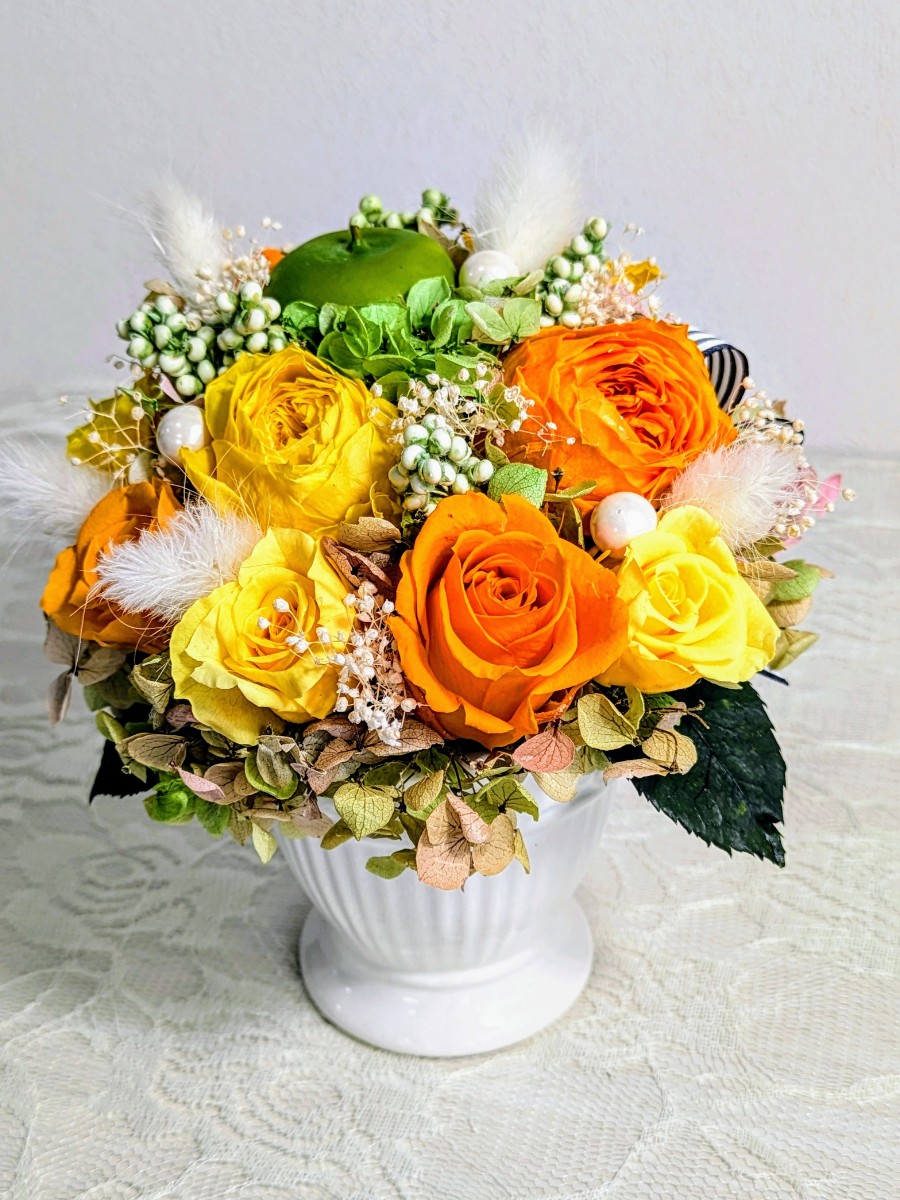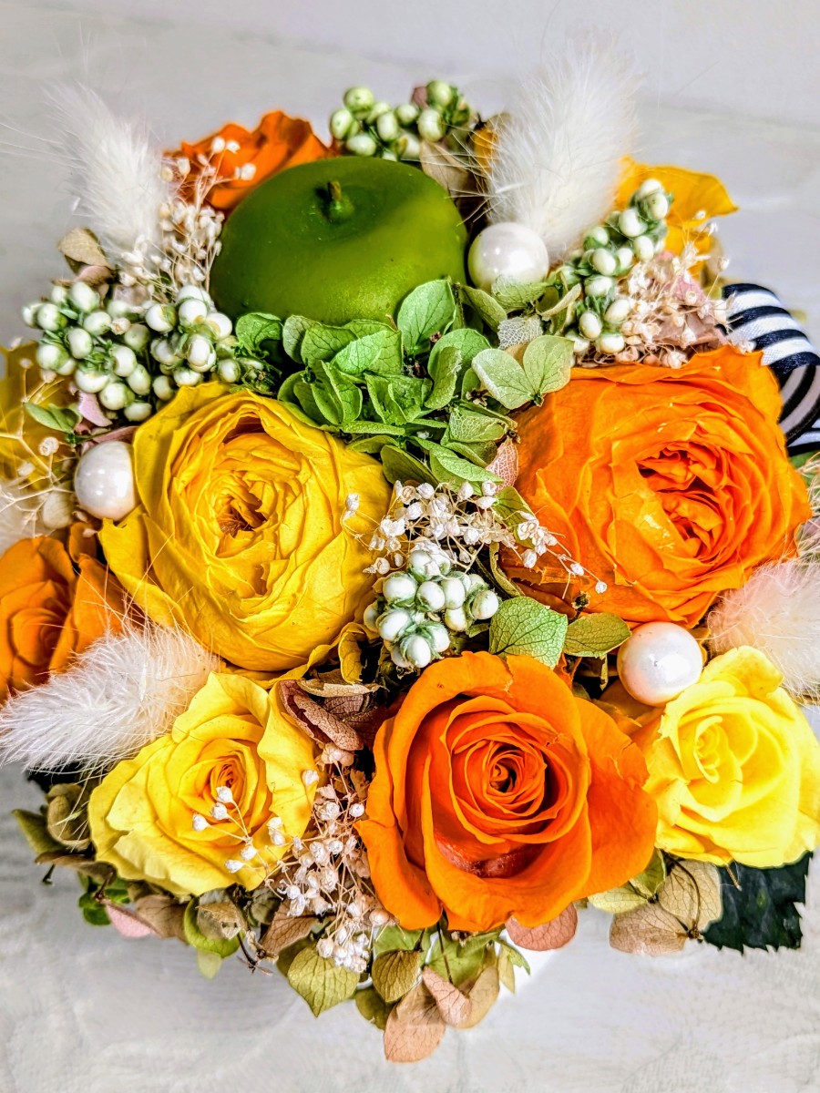 元気が出るビタミンカラー素材を沢山したプリザーブドフラワーアレンジです。