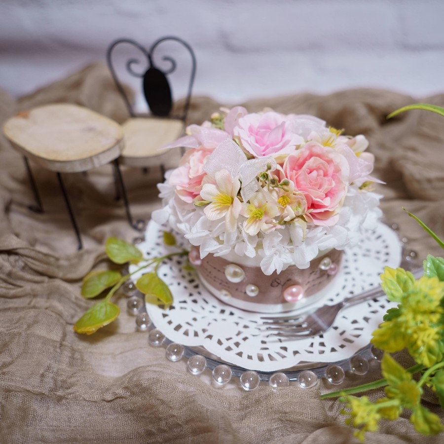 アーティフィシャルフラワーでデコレーションした、可愛いフラワーケーキアレンジです。