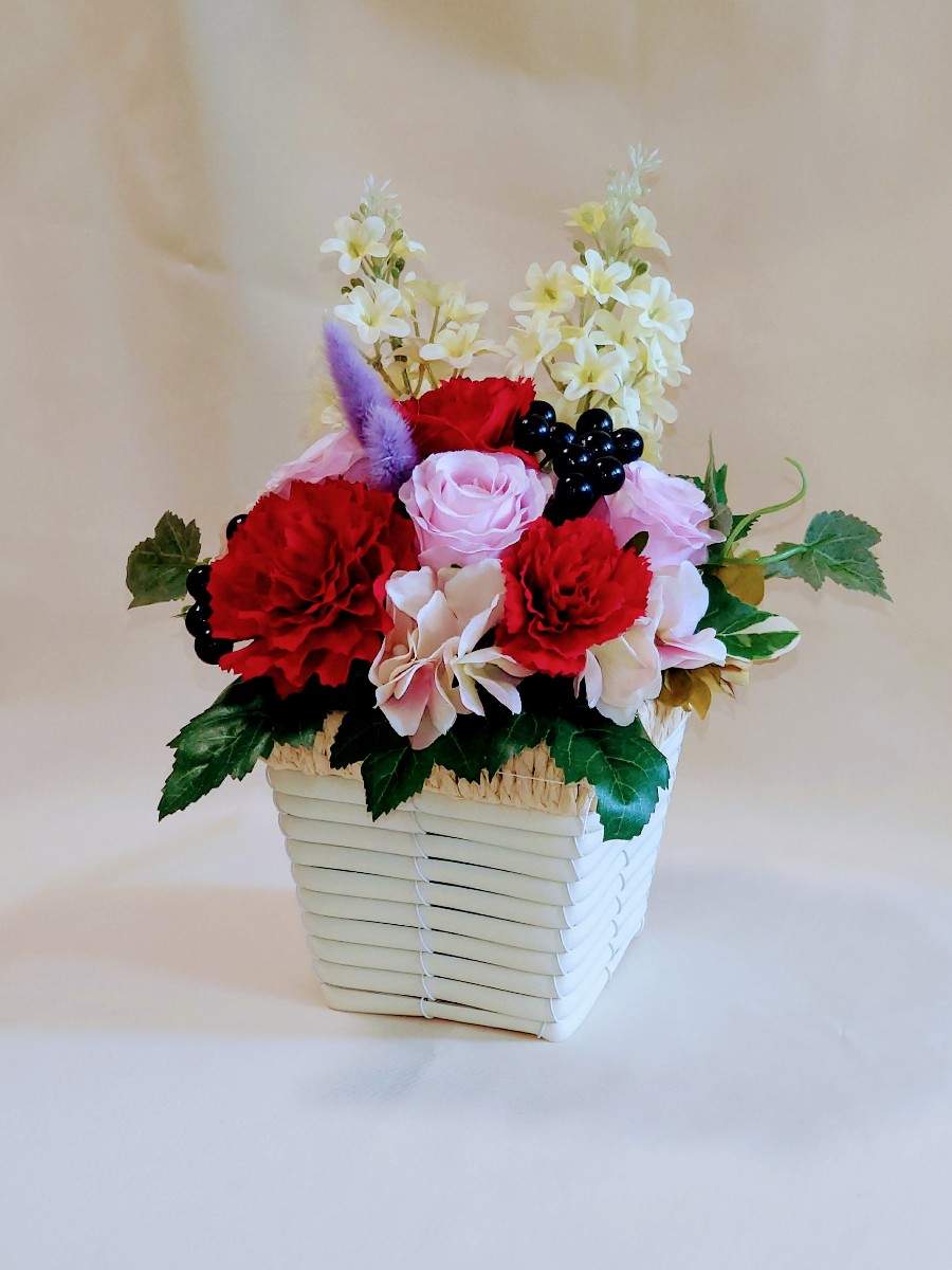 母の大好きな赤いカーネーションをメインに、シンプルかつ華やかにアレンジしてみました。