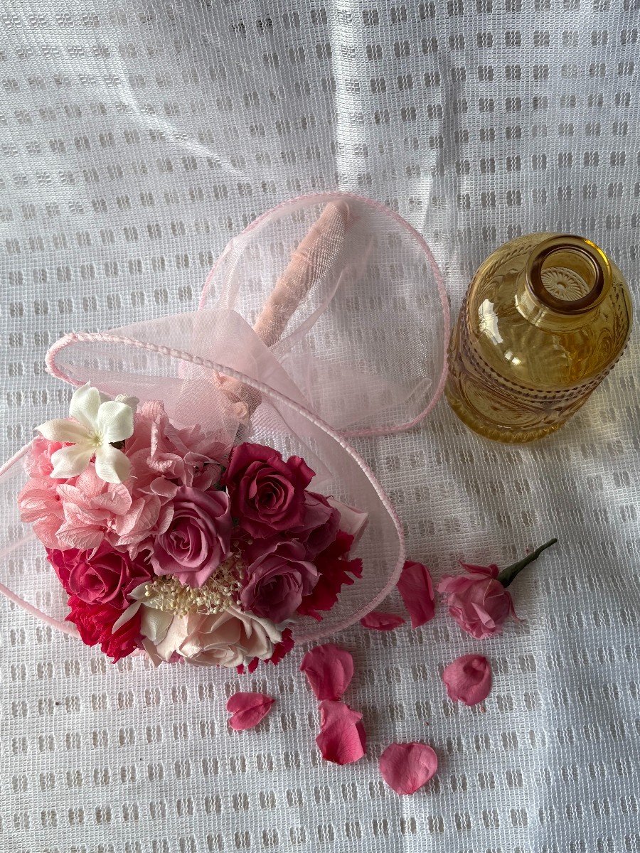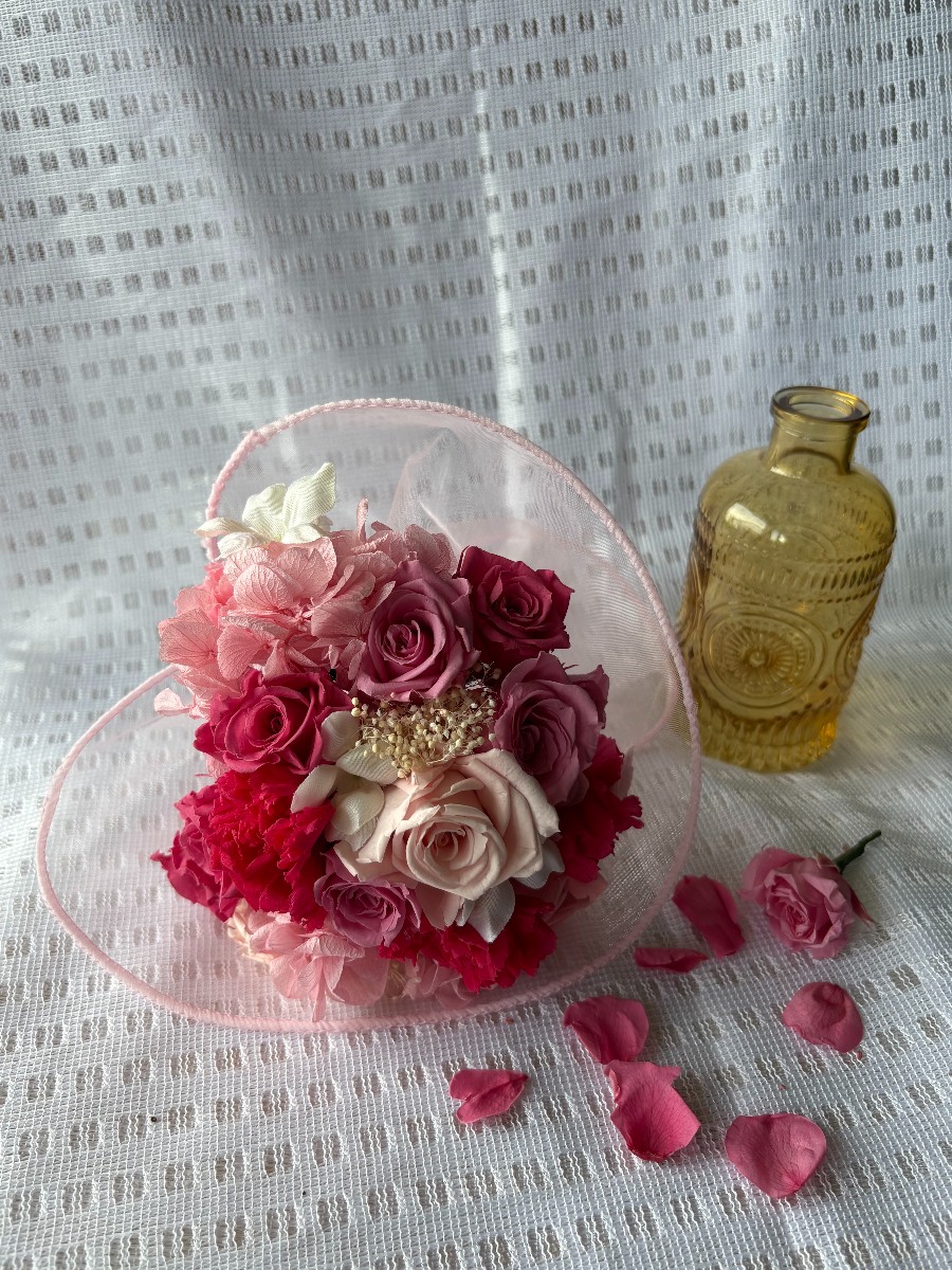 母の日に際し、天国の母に心を伝えたくてハート型に組みました。温かみのある色にしたくてプリザのいずみやビビアンを中心にチェリーピンクとシャーベットピンクを合わせました。定番のカーネは少ないのですが。。。。