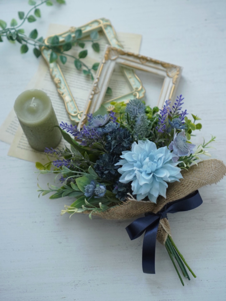爽やかなグリーンやラベンダーとブルー系のお花をMIXさせたシンプルなスワッグです。